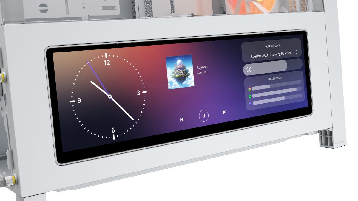 The standout feature is the pre-installed Xeneon Edge display. This 14.5-inch AHVA panel offers a native resolution of 2560×720 and supports five-point multitouch. Designed to function as a secondary Windows display, it connects to the user's GPU via HDMI or DisplayPort over USB-C. The screen is intended for real-time system monitoring via iCUE widgets, displaying chat or music applications, or serving as a dedicated dock for AI tools, allowing users to offload tasks from their main monitor.