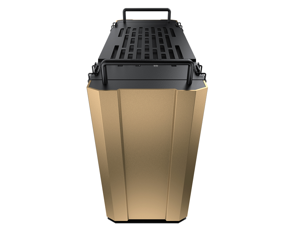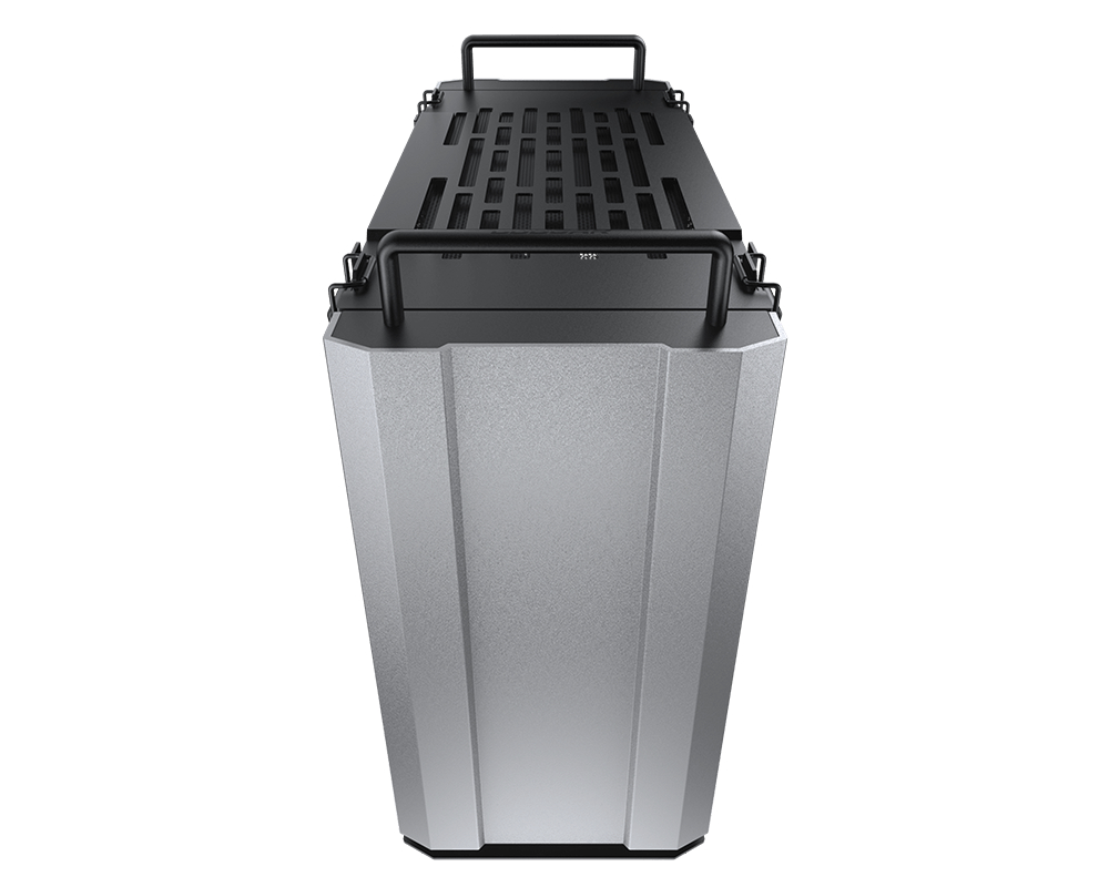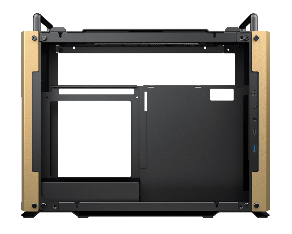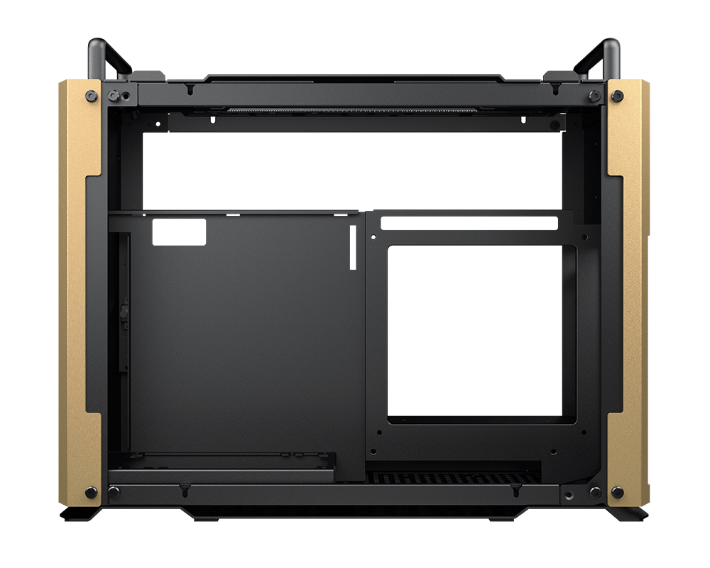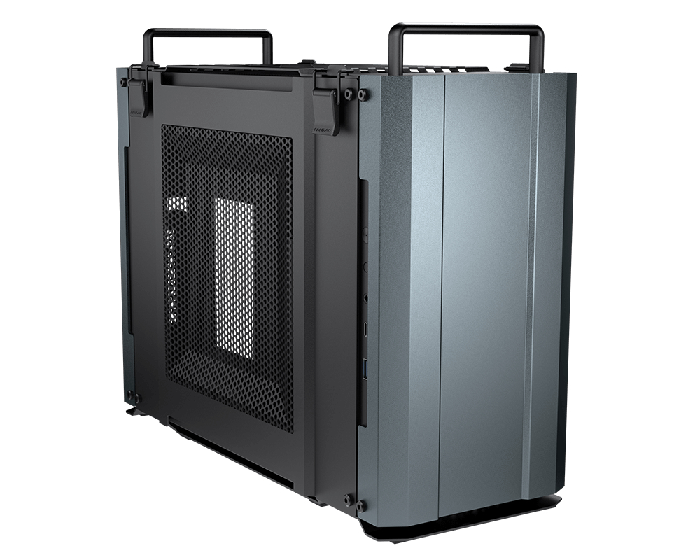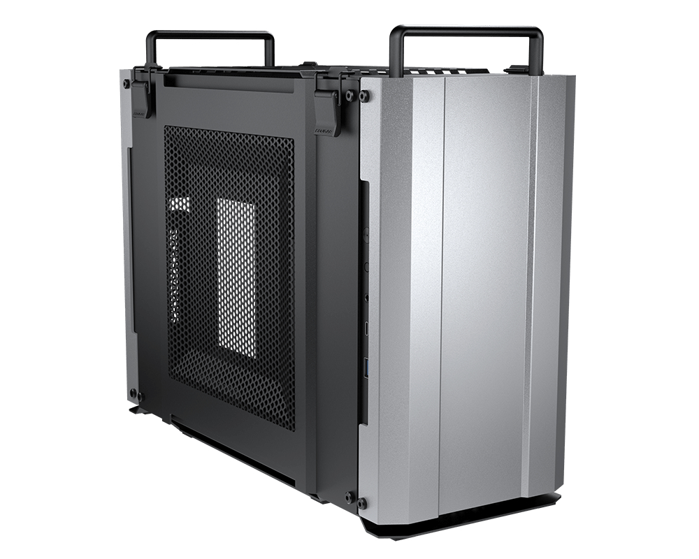 The two handles on top let you easily transport the case through your house if you want to play in the living room or bring it to a LAN party. On the inside, you'll find two individual chambers: one for the CPU and the PSU and another for the GPU. Both intake air directly from the outside thanks to the meshed side panels, but each has its own airflow path. In this design, heat from different components shouldn't affect each other, lowering system temperatures to prevent throttling.
