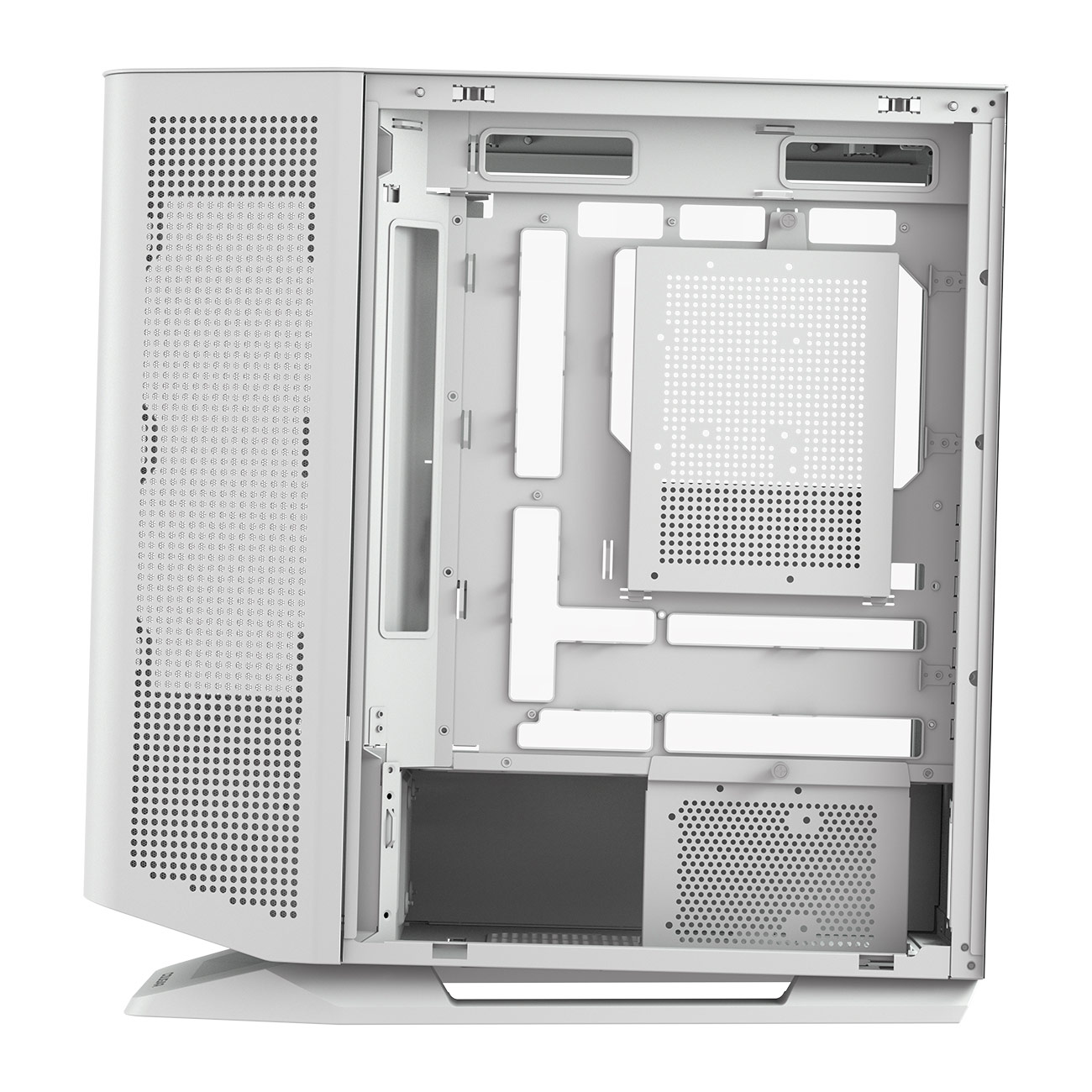 The FV270's expansion slots can be turned 90°, allowing for vertical alignment of graphics cards, although a riser is not included. The motherboard tray (up to E-ATX) also features a support that prevents graphics cards from bending, and the side of the case contains space for an extra two 120mm or 140mm fans, or up to a 280mm radiator for liquid cooling. The PSU shroud also supports up to a 240mm radiator, and the top vent has room for up to a 360mm radiator, or three 120mm fans.