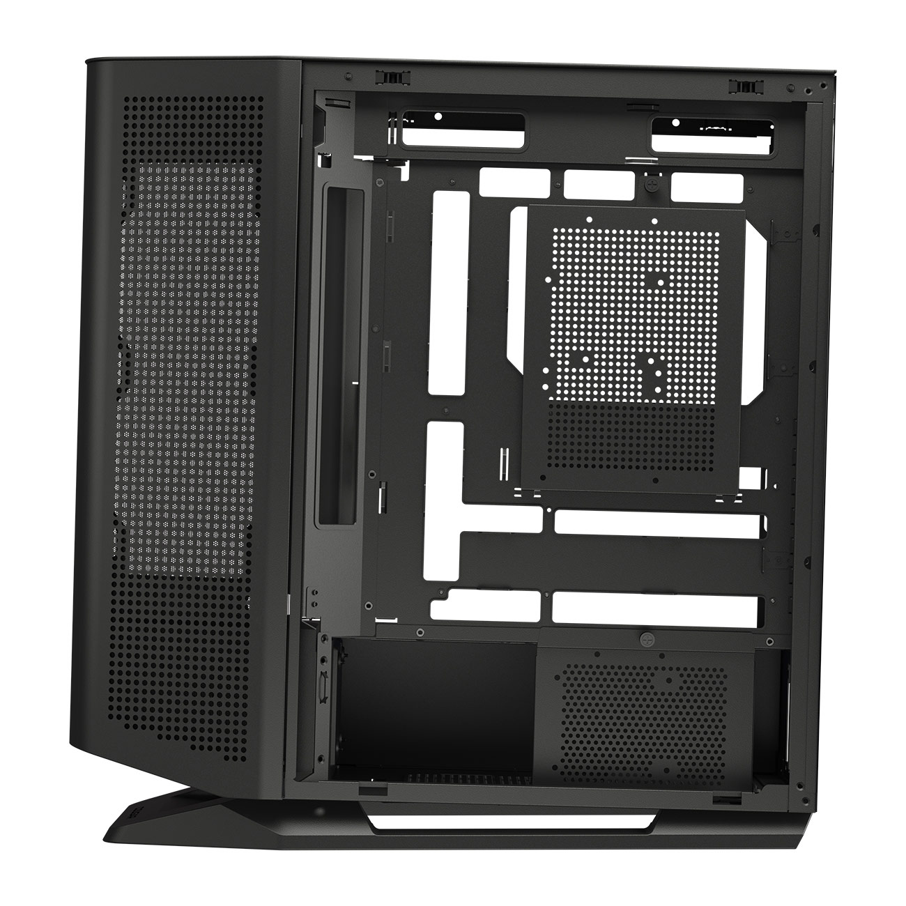 The front-bottom compartment features a 120mm fan positioned diagonally and is distinctively visible thanks to its RGB lighting. Moreover, the top compartment of the case, which houses the motherboard tray, can accommodate graphics cards up to 450mm in length (420mm horizontally) and CPU coolers up to 180mm tall. The bottom compartment of the case has enough space to fit power supplies up to 250mm long, along with a drive cage with two 2.5-inch drive bays or a 3.5-inch bay. Two more 2.5-inch drives (or a 3.5-inch drive) can be installed underneath the motherboard tray.