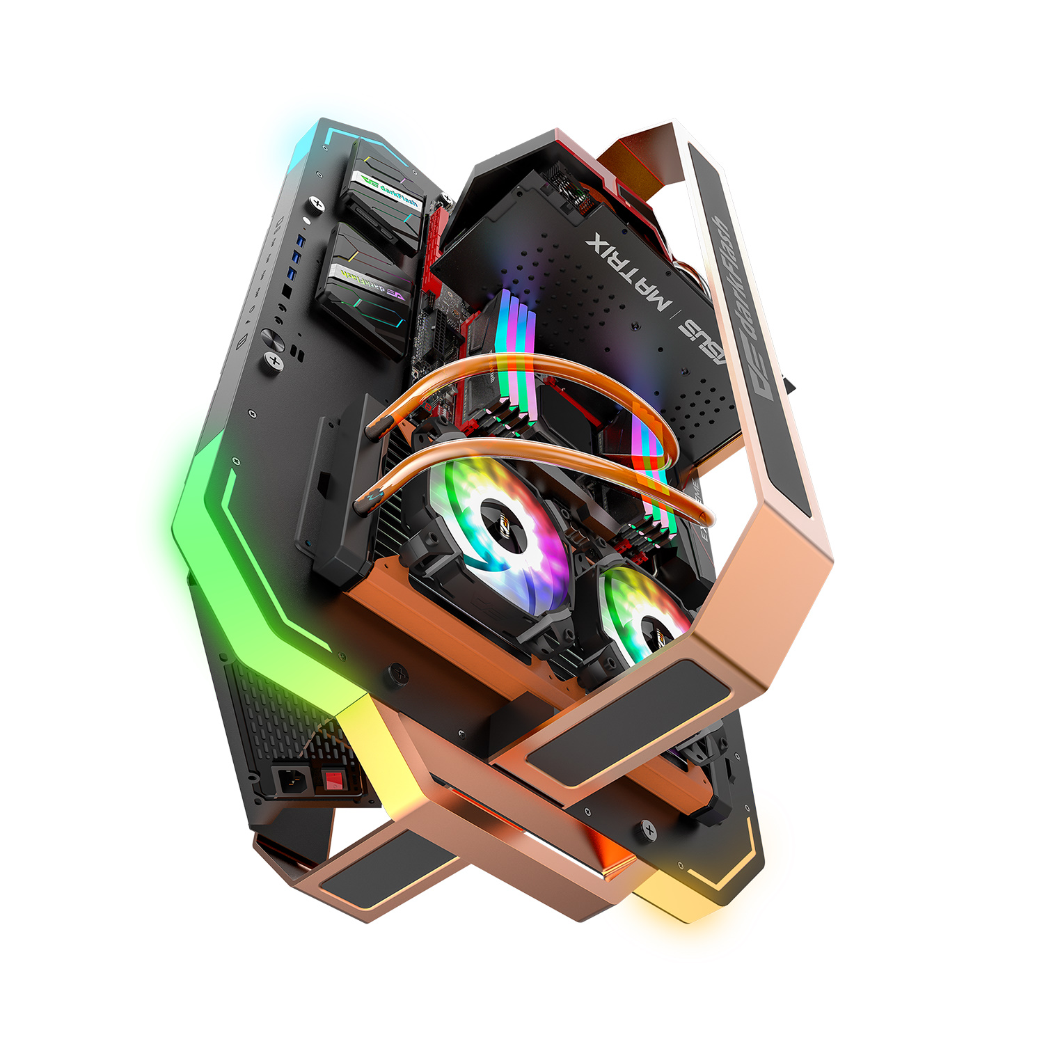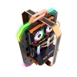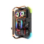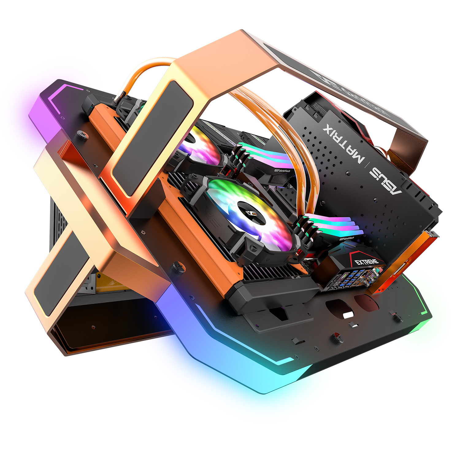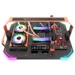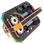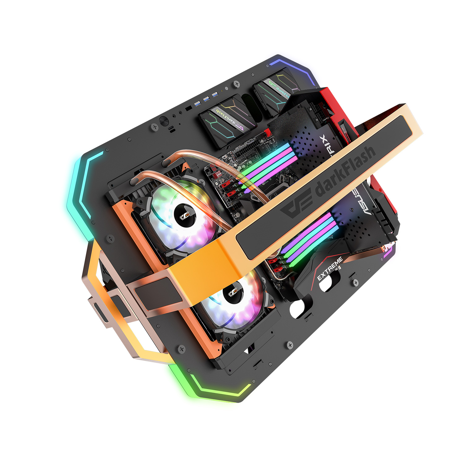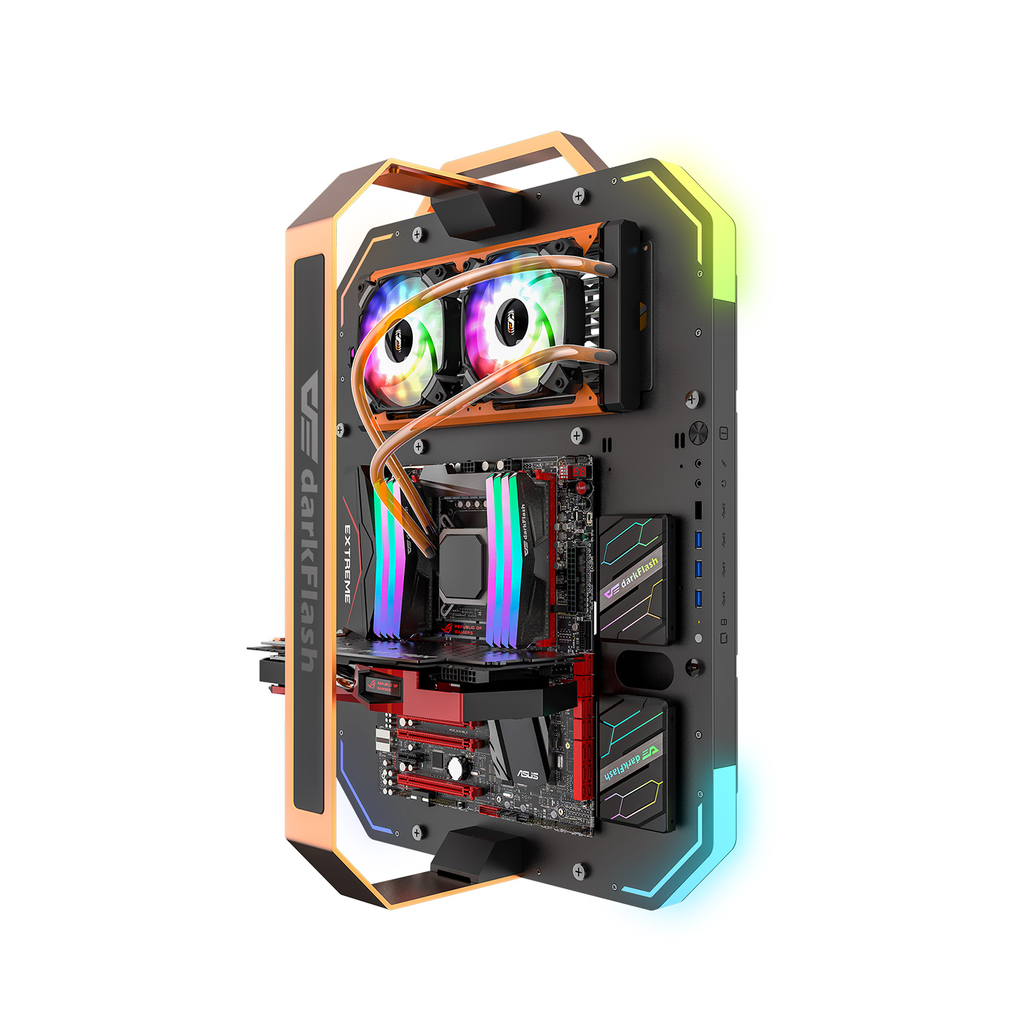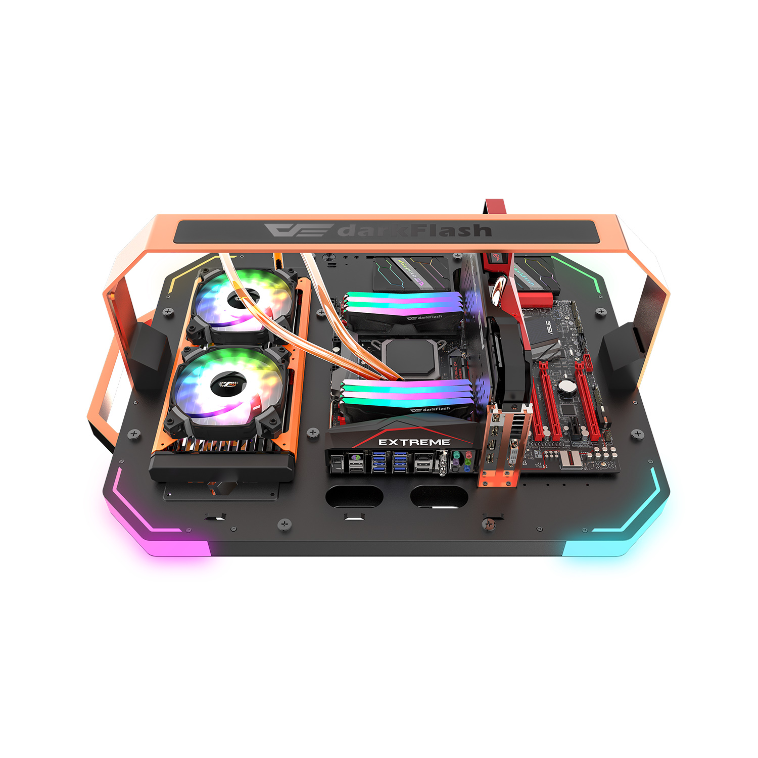 Like most open chassis, the darkFlash Blade-X looks to be great for showcasing hardware. Featuring two orange bars made of 4mm thick aluminium across the 1.5mm thick SECC system tray, the Blade-X chassis has a 27mm thick aluminium handle where the bars cross to transport it more easily. Each bar features A-RGB lighting strips with 12 light effects in the corners.