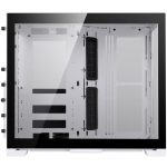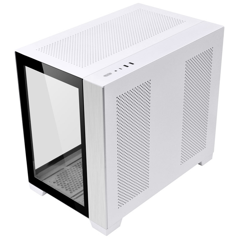The case is mostly made of aluminium and tempered glass, with slight differences between both colours. The front panel is fully covered in tempered glass on the black case and made of brushed aluminium and tempered glass on the white case. The I/O panel, which features 2x USB 3.0 ports, a USB-C 3.1 port, HD-Audio and the power button, is covered acrylic on the black case, while the white one is made of aluminium coated in white.