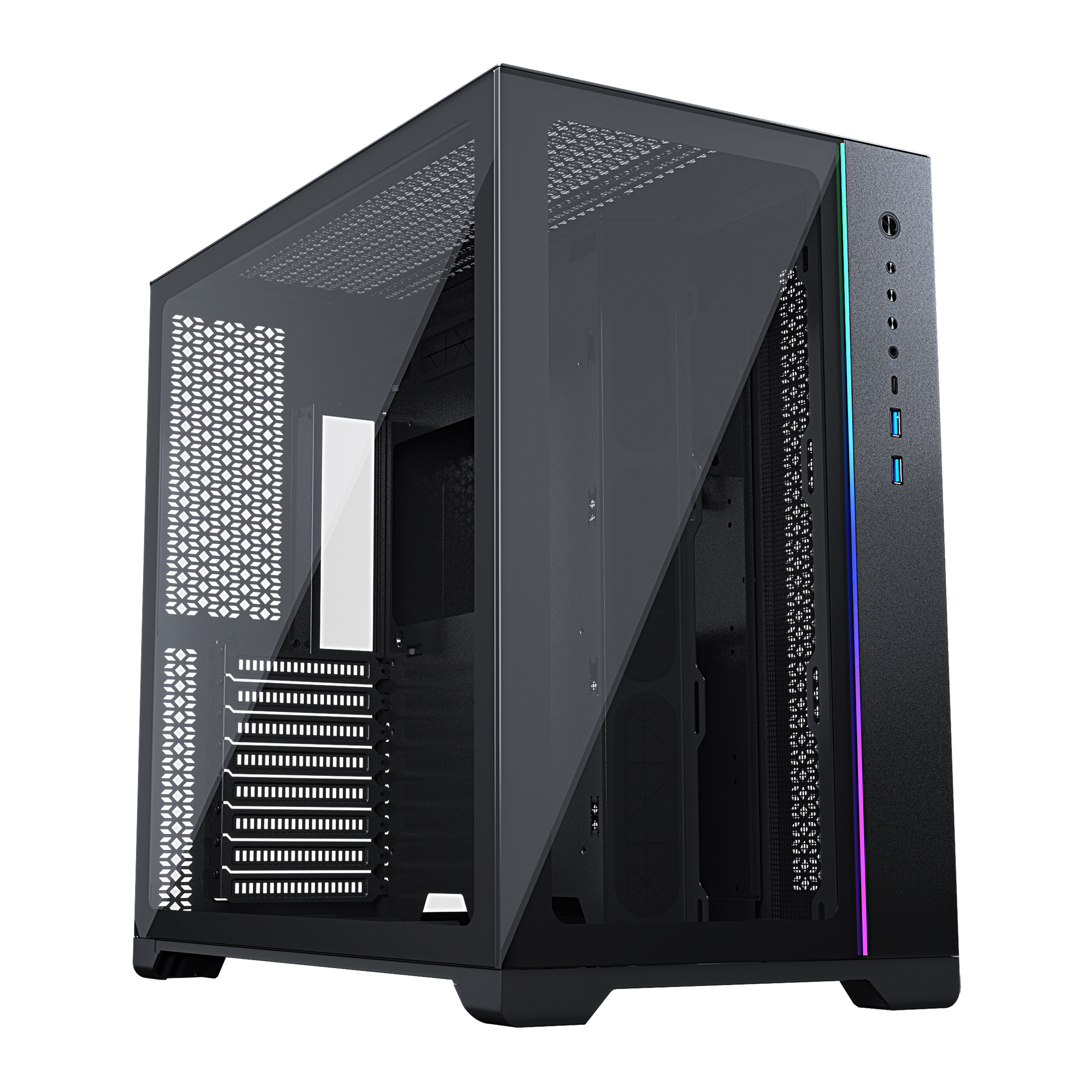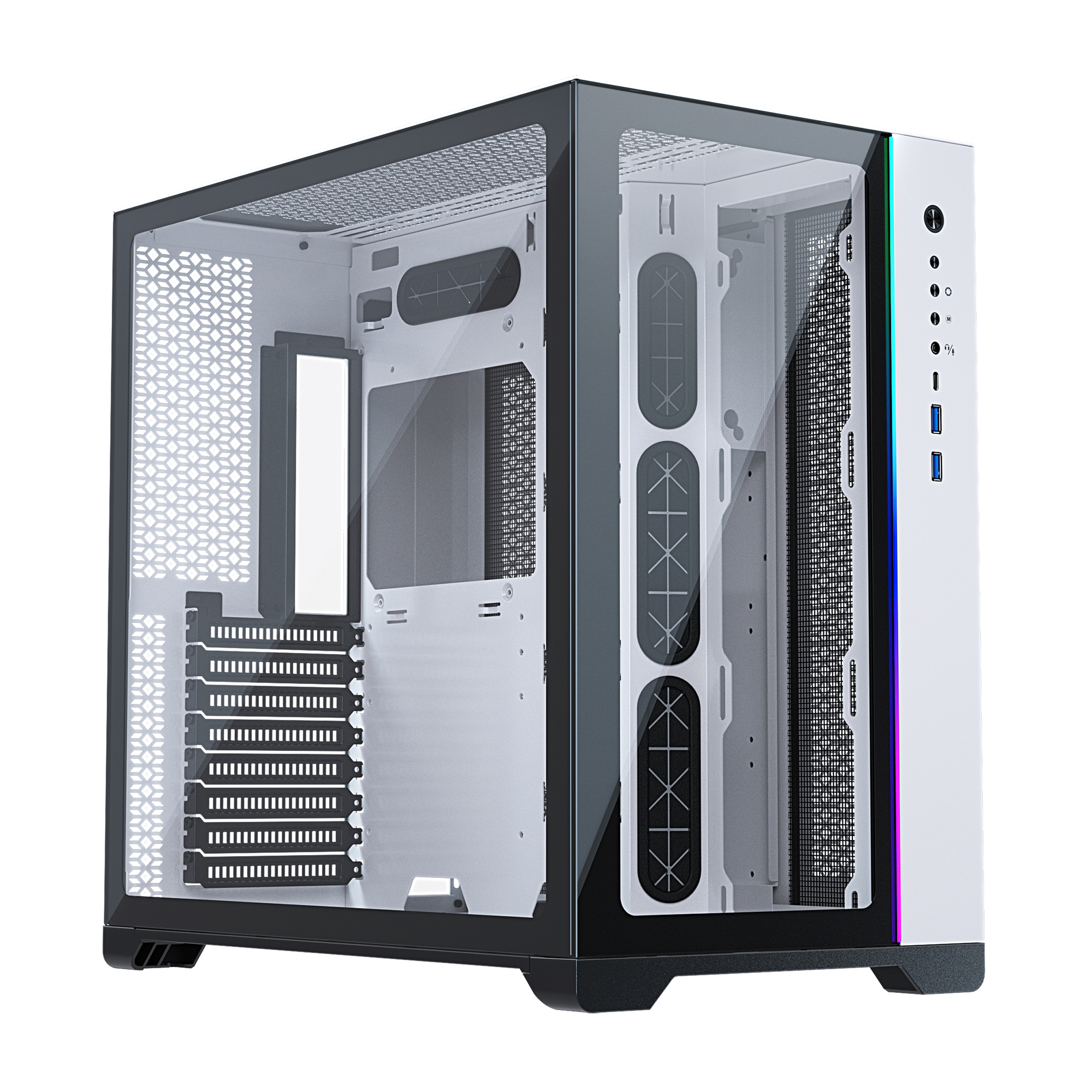 The dual-chamber design allows for the installation of not one but two motherboards – a primary motherboard which can be E-ATX, ATX, Micro-ATX, or Mini-ITX, while the secondary board must be Mini-ITX. The spacious interior allows for an extensive combination of cooling hardware, that alongside the mesh on the top, side, and back of the case, delivers “the next level of cooling for even the most demanding dual system setups”.
