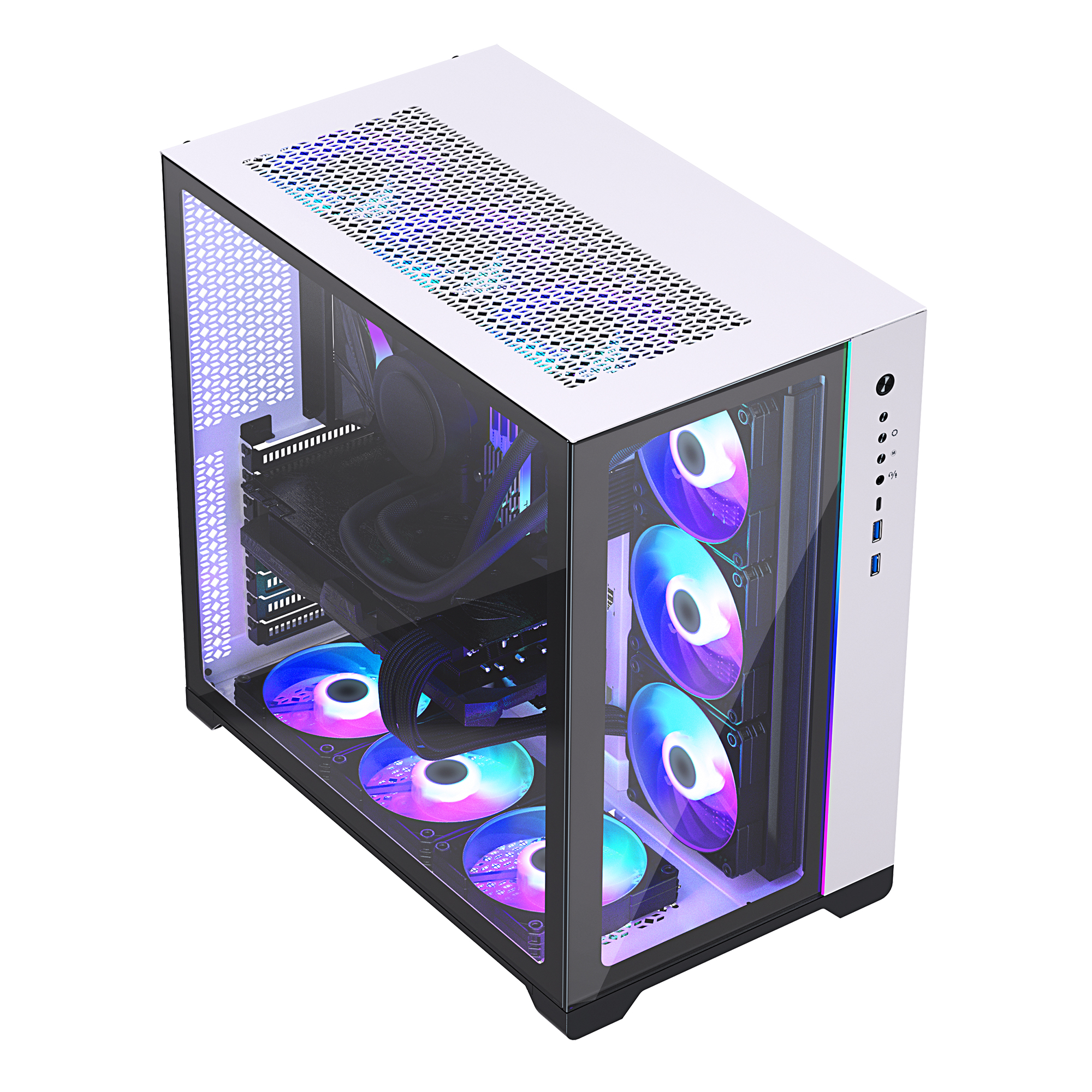 On the side, the Neo Qube can house up to 3x 120mm fans and a 360 radiator (140 and 280 not compatible). On the top, besides supporting up to 2x 140mm fans, it's also possible to mount up to 3x 120mm fans and a 360 radiator. The bottom supports up to 3x 120mm fans or 2x 140mm fans, and a 360 radiator (140 and 280 not compatible).