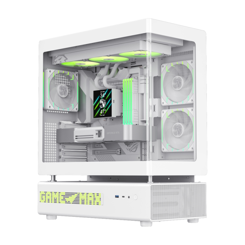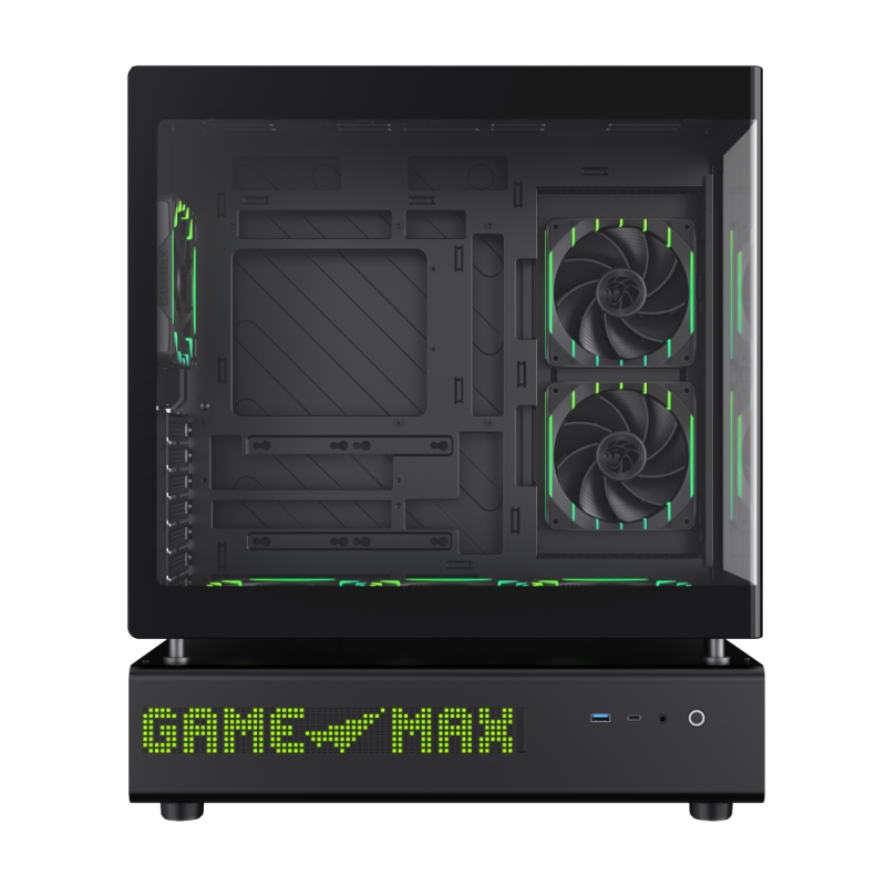 The N90's most striking feature is its panoramic view, created by a single piece of curved tempered glass that wraps from the front to the side without a corner pillar. This is complemented by a 512-LED dot matrix display on the left side, which can be customised to show system stats or retro-style images. In addition, GameMax also includes two interchangeable magnetic top panels in the box: a standard high-airflow vented panel and a wood-finish panel for a more elegant look.