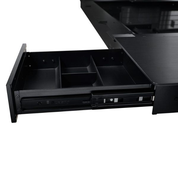 Below, Lian Li has ensured that no space is wasted, incorporating two drawers with retractable storage compartments for essential items. Adjacent to each drawer are connectivity options, including Reset and Power buttons, two USB-A 3.0 ports, two USB-C ports, and a 3.5mm HD Audio jack, ensuring that everything is within easy reach. Adding to its practicality, the DK07 boasts a wireless charging station and a hub equipped with USB-A and USB-C ports. A clever design feature allows the connecting cord for this hub to be discreetly stored in a dedicated area at the back of the tray, helping to keep your workspace tidy.