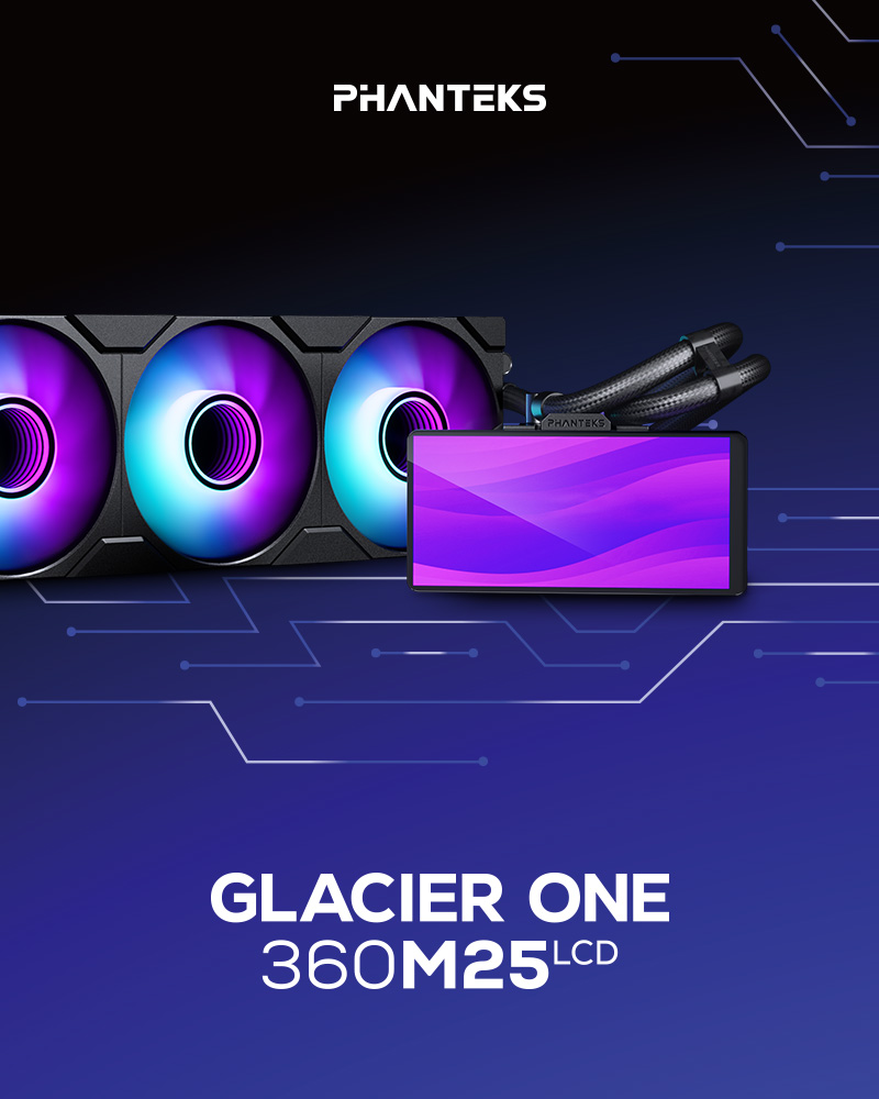 Expanding on their successful Glacier One line of AIOs, Phanteks presents the new Glacier One 360M25 LCD. This cooler features a large 6-inch IPS display on the pump, offering 1580×720 resolution at 30 Hz, with full customisation via Nexlinq for system metrics, images, and effects. It includes three M25 Gen 2 fans, balancing performance and value.
