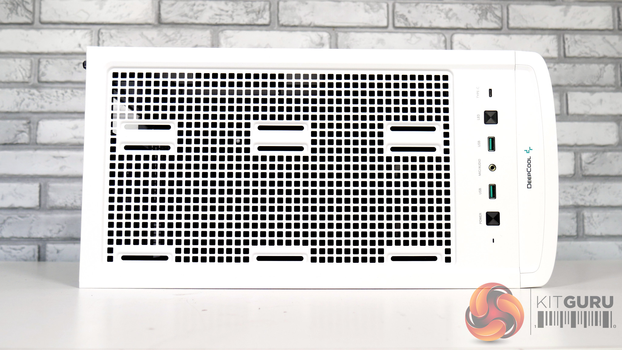 To the top of the case, we have a neatly arranged front Io consisting of the power button, two USB 3.0 ports, an audio combo jack, a USB 3.1 Type-C port, an LED button for changing the ARGB included with the case fans, and an activity LED. The layout here is really nice and I love the touch of green that DeepCool includes here to the USB ports and the DeepCool logo.