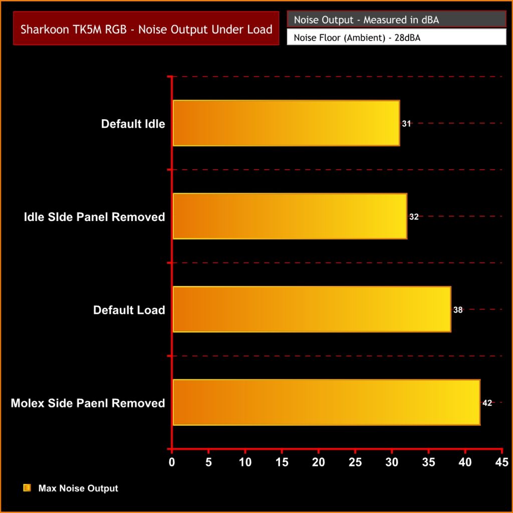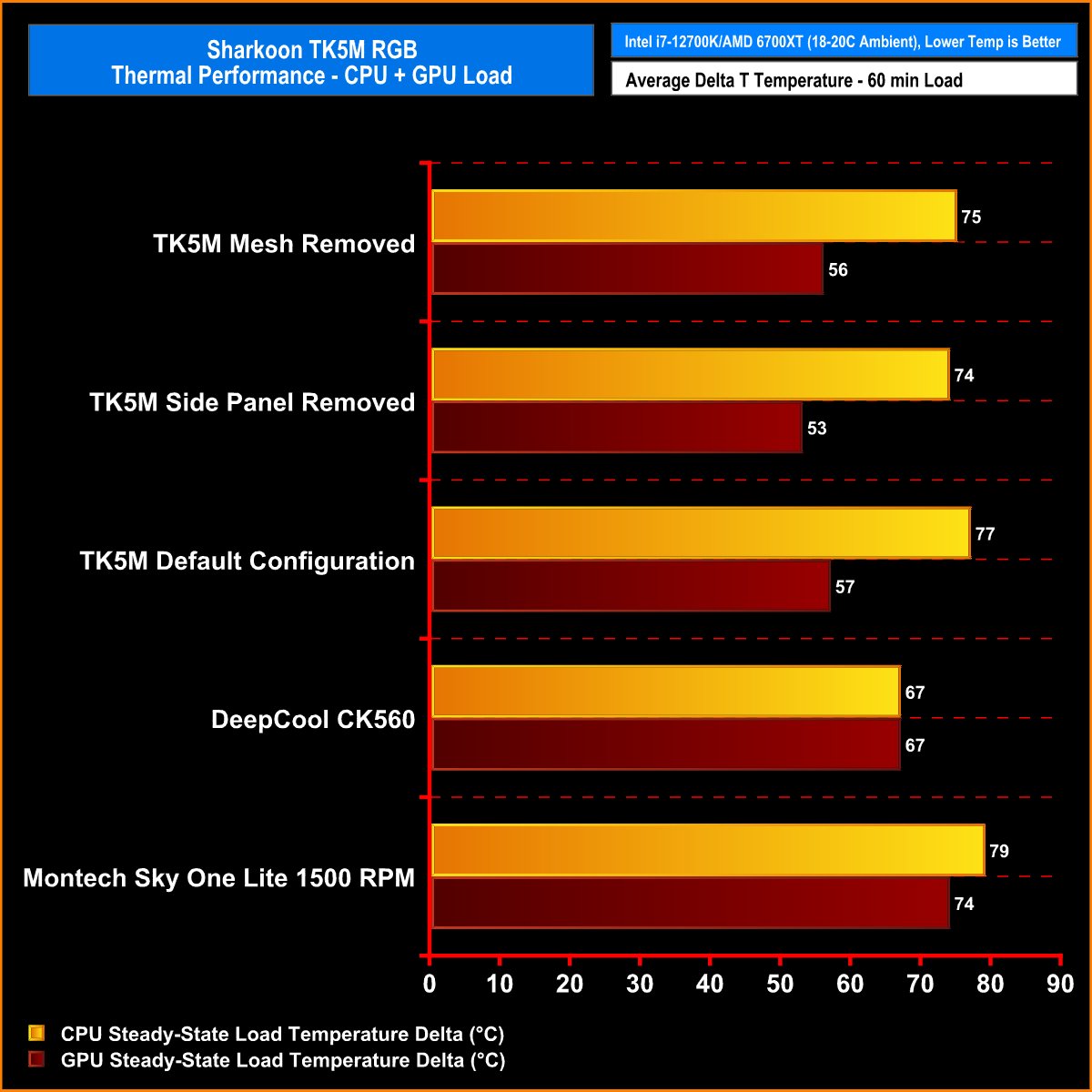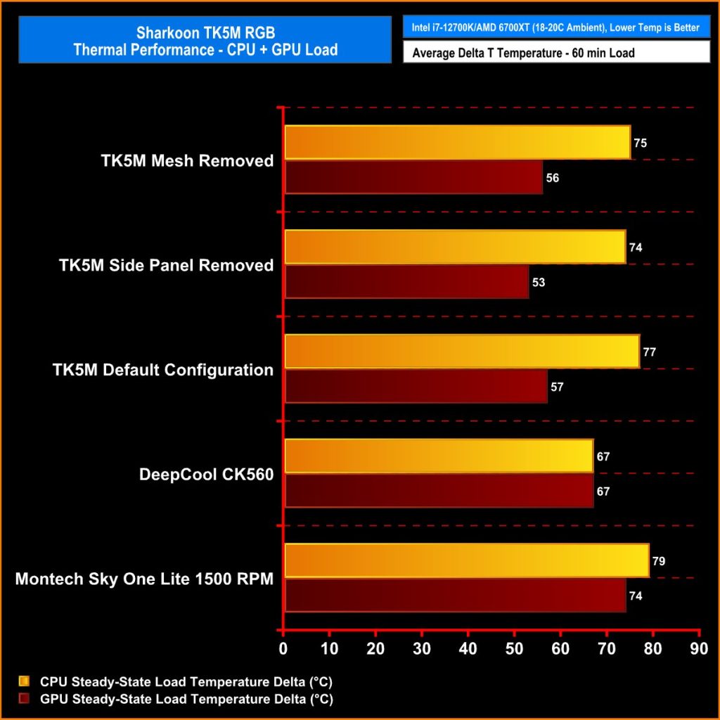 The Sharkoon TK5M RGB kept the Intel i7 12700K and Gigabyte RX6700XT temperatures under control and the verdict is that the case performed very well indeed.