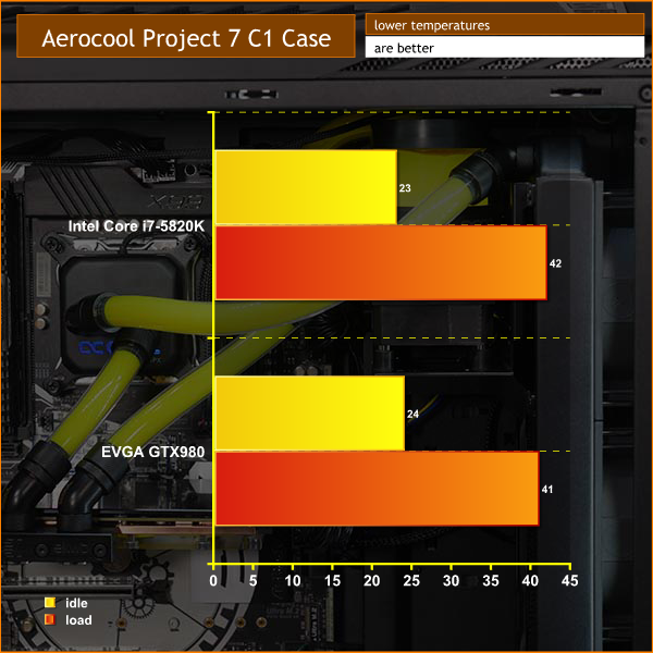 Our chosen liquid cooling hardware kept the Core i7-5820K and GTX 980 nice and cool. This may be a relatively compact chassis but it has no trouble flowing enough air. We had the same experience with the AWD-IT PC with air cooler on the AMD FX CPU so this is not a one-off observation on our part.
