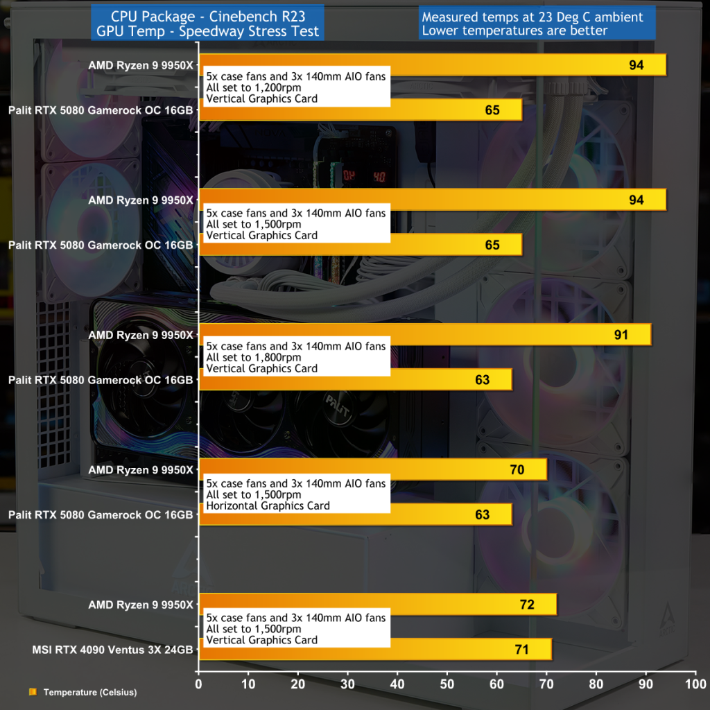 In our testing the Arctic Xtender acted like two completely different cases. With the Vertical Graphics riser removed it works just fine and keeps both CPU and graphics card nice and cool. However, with the riser installed, we had a distinct problem where our Palit RTX 5080 graphics card and Arctic AIO cooler clashed and drove up CPU temperatures by 20 degrees C. Switching out the huge RTX 5080 for a slightly less huge MSI RTX 4090 was just about OK with the vertical riser, as we demonstrate in our video. Our conclusion is that you need to proceed with caution and carefully select components that work together correctly.