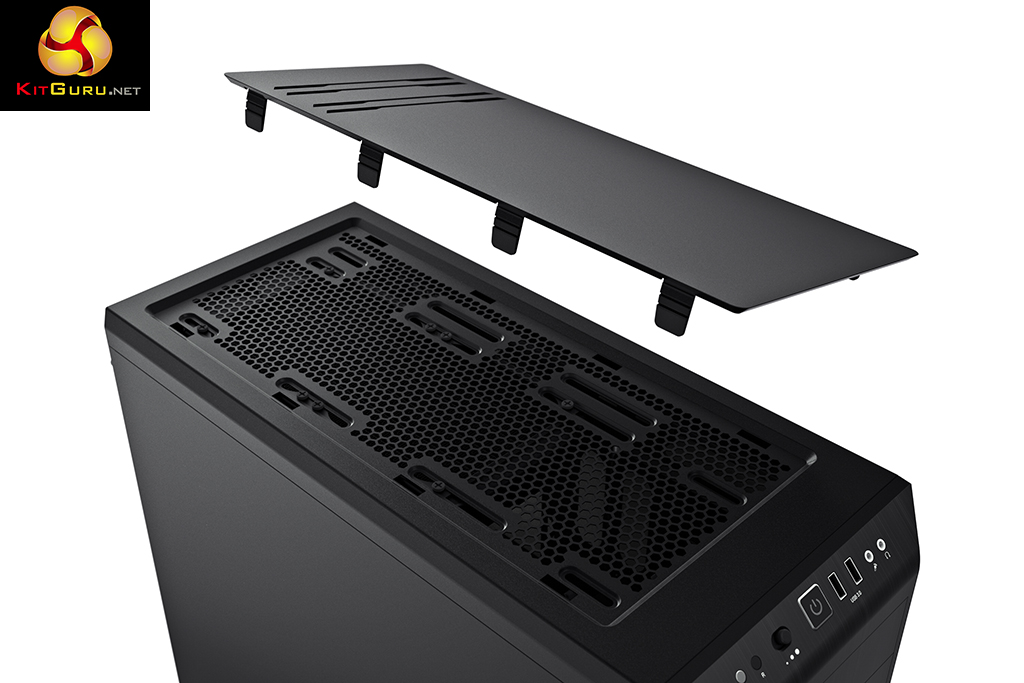 The removable vent panel on the top of the case is a pain to remove and appears to be a more awkward version of the ModuVent used by Fractal Design. In fact the eight mounting clips double up as supports so the top panel can be raised slightly, further or removed completely. In our video the panel is in the higher position.