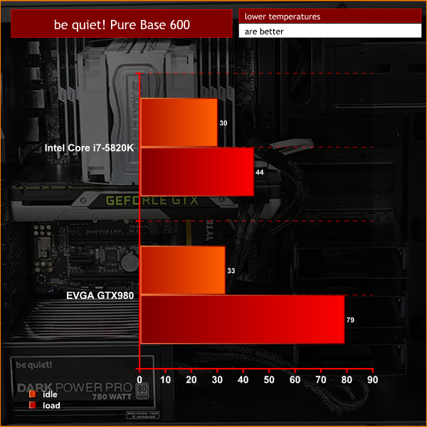 We had few expectations about the Pure Base 600 and were pleasantly surprised by the low temperatures we observed during our stress tests. Those front air intakes may look restrictive but running the case with the top panel raised guarantees you will have no problems with air flow. Thumbs up to be quiet! on this front.