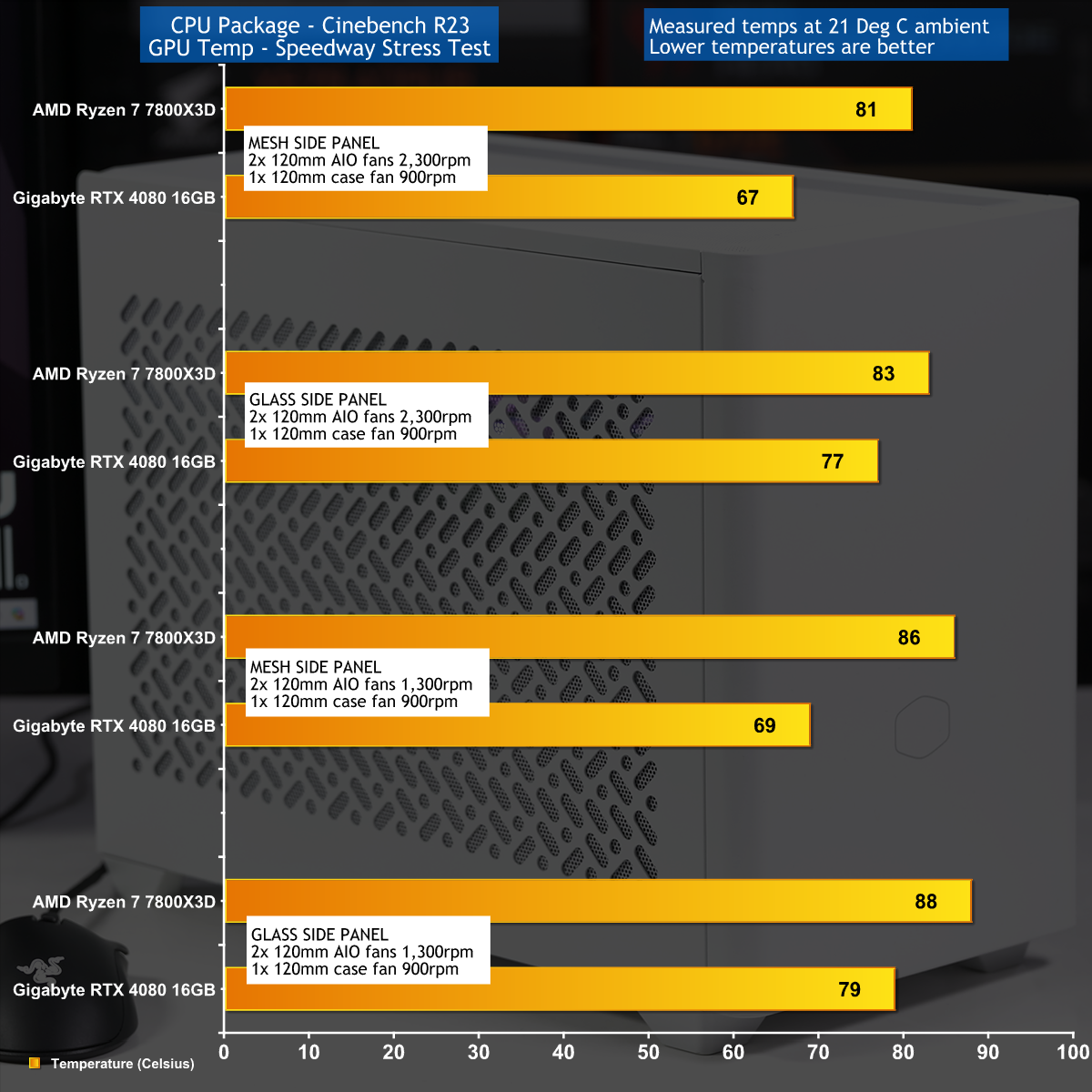 In our video we demonstrate the difference in noise levels when you run the fans fast and slow, and this naturally also has an impact on temperatures. The single biggest factor for the temperature of your graphics card is whether you use the glass or mesh side panel. The takeaway here is Mesh For The Win.