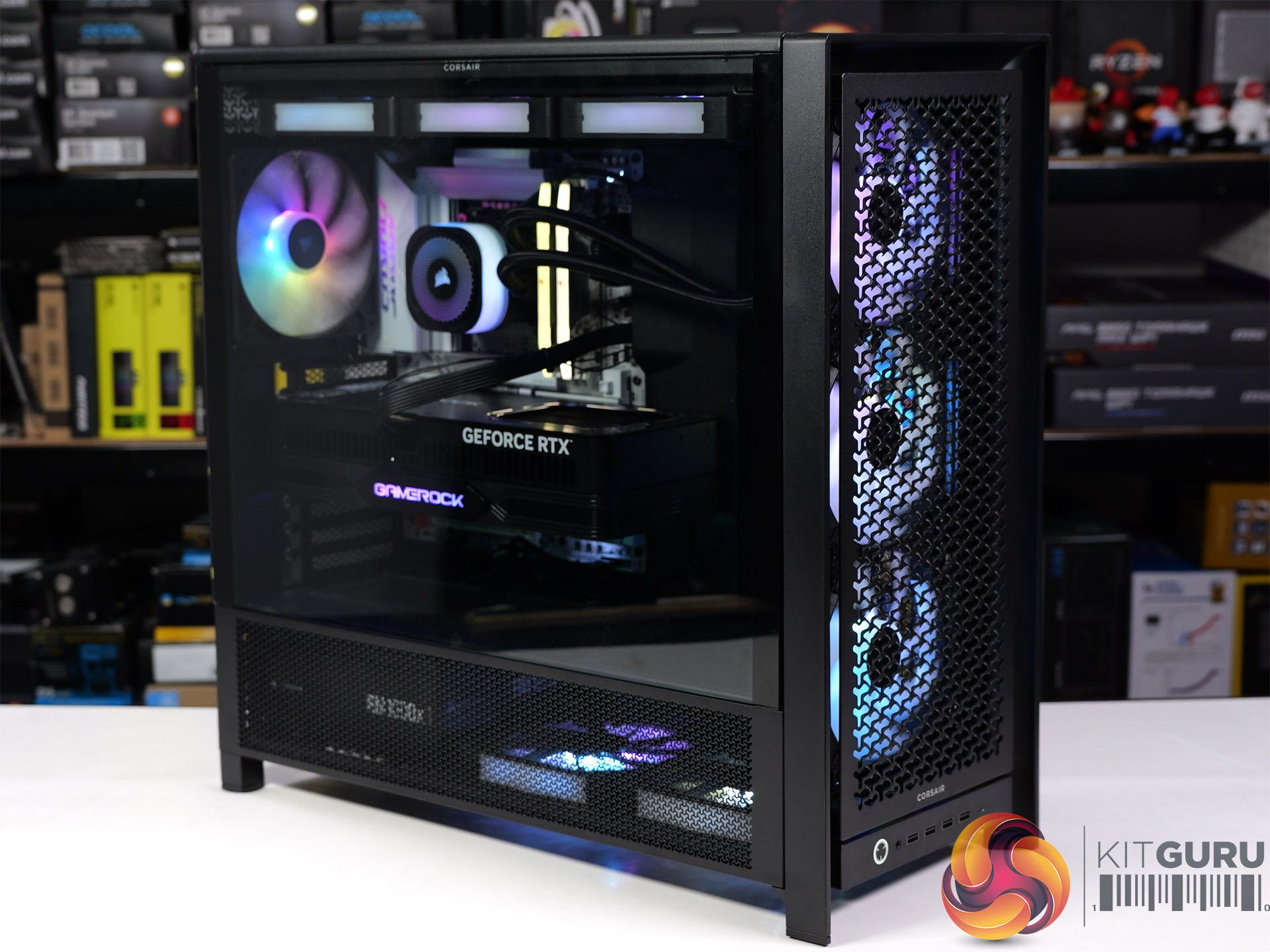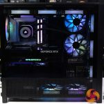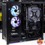 As you will see in our video, once we had installed the Corsair 420mm AIO cooler the correct way round we then tried some different fan configurations. We started with the stock configuration of four 140mm case fans with three 140mm fans on the AIO cooler. After that we removed the filters in the front and side, partly to remove obstructions, but mainly to improve the lightshow in our video. After that we installed two Corsair RX140 RGB fans in the floor of the case. Our final step was to replace the stock RS140 fans in the front of the case with RX140 RGB fans, open up the side ventilation in the case and then install two more RX140 RGB fans in that location.