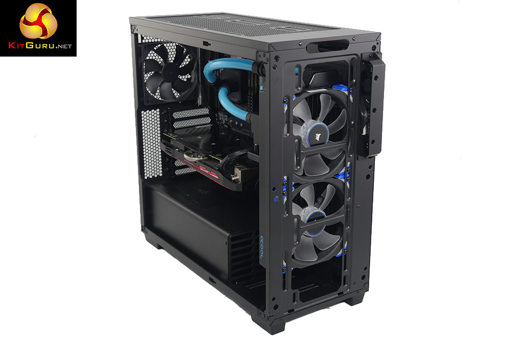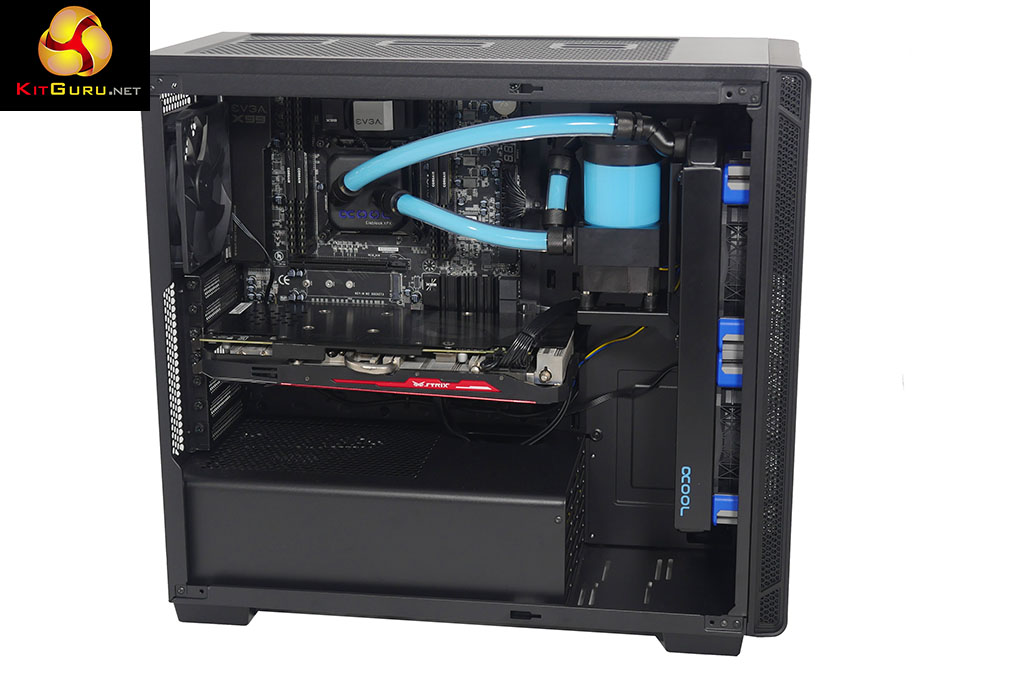 As we point out in our video this isn’t a recommended specification but more a way of showing what is possible. The CPU loop slipped into place without drama and the mighty Asus Strix R9 390 graphics card had loads of space. Admittedly we made life easier by using a Micro-ATX EVGA motherboard but we had no need for a full ATX motherboard so it seemed like a logical choice.