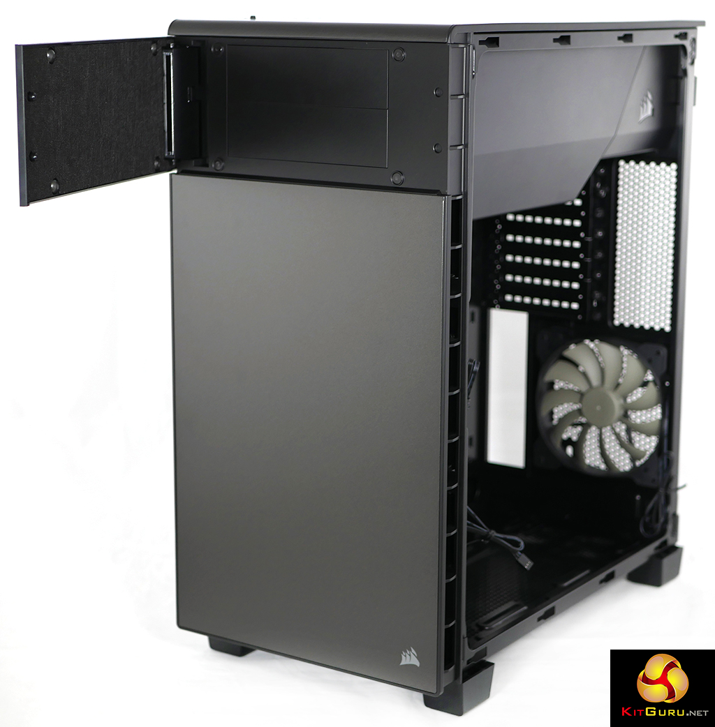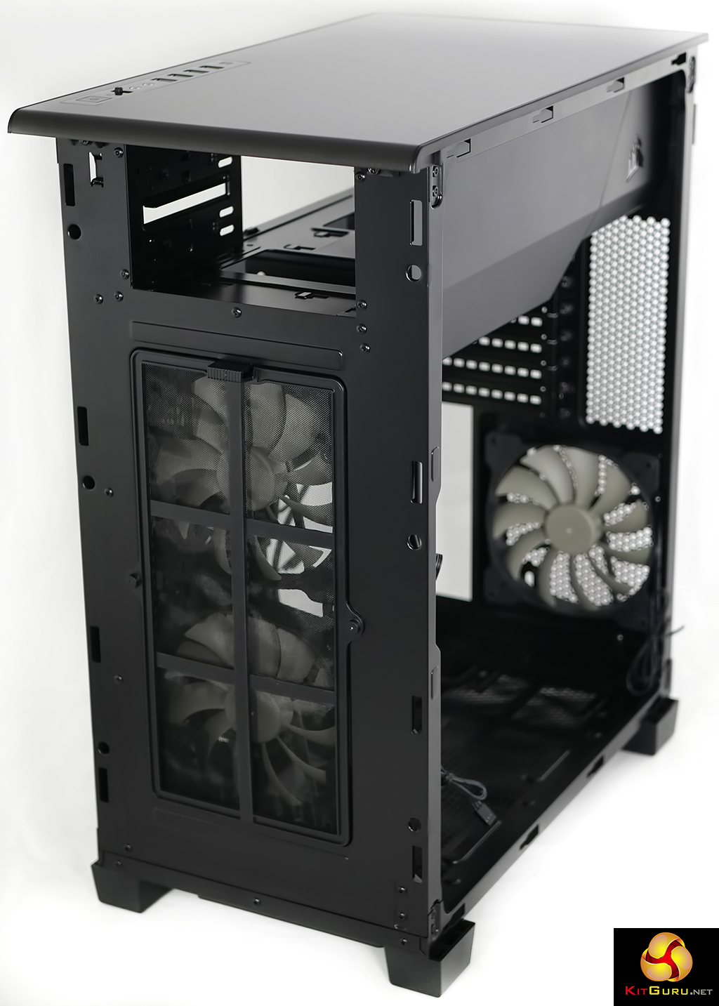 This means the 8-pin EPS connector ends up at the bottom of the case and the USB and audio headers are up at the top. Corsair has moved the power supply housing from the traditional location at the bottom of the case to a chamber at the top.