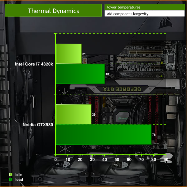 Corsair Carbide 600C with the addition of a 280mm liquid cooler is epic. This chassis had no problem keeping our Core i7-4820K running at a low temperature. Our GTX 980 graphics card ran at its usual 78 degrees under full load. Cooling in this chassis is top notch.