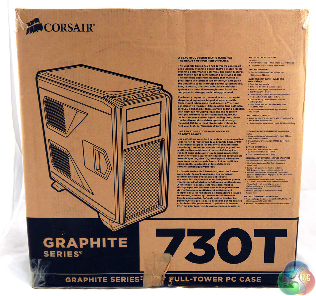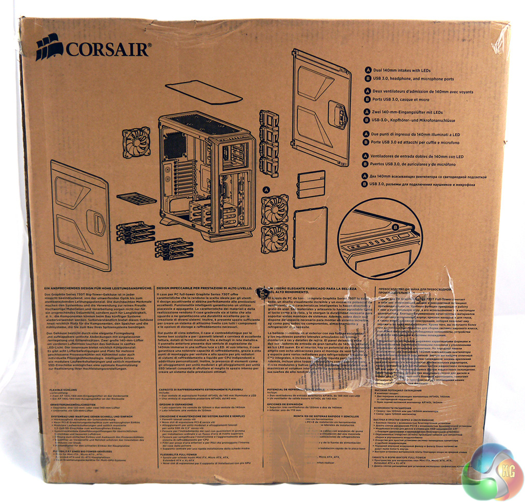 On one side of the box there is an exploded diagram that shows the main features of the 730T and it is evident that Corsair has taken care to illustrate the 730T rather than muddy the waters with a 730T/760T package.