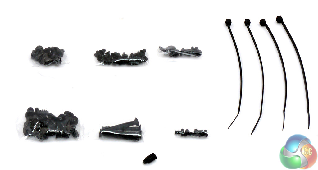 Open the hinged main door and you'll see that one of the drive bays contains a box of accessories that consists of various bags of screws and four cable ties.