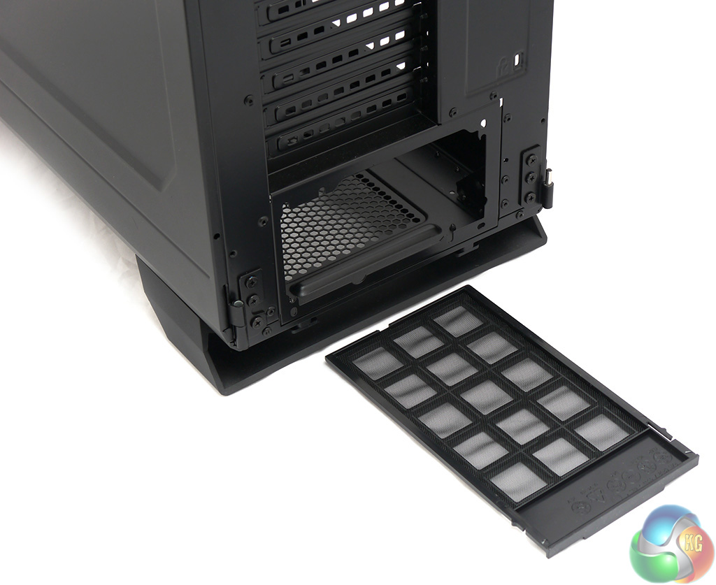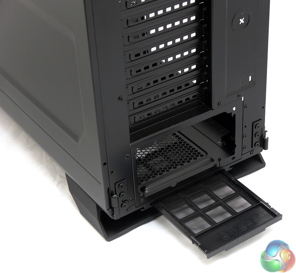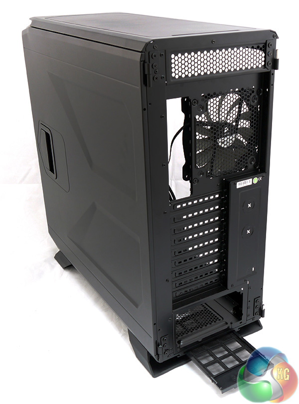 At the rear of the case there is a fair amount of ventilation. The panel above the fan is heavily perforated, the blanking plates in the expansion slot are punched with holes and there are a couple of knock out tabs for external water cooling.