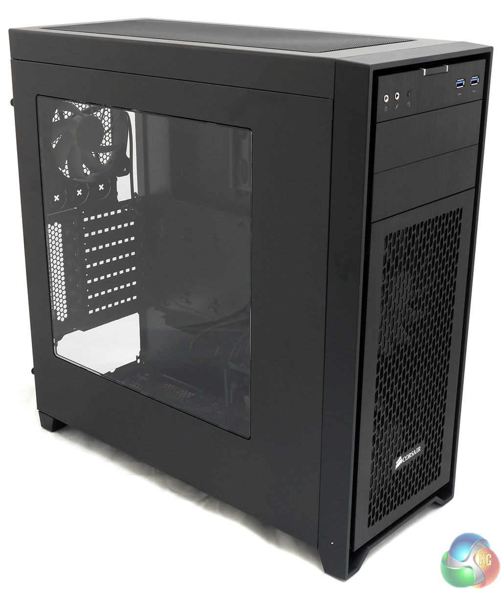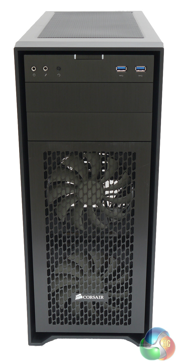 OK here's what we're talking about. The front of the case is dominated by a ventilated front panel that clearly shows the two Corsair AFL140L intake fans. These fans are based on the AF140, however there are no coloured lights or rubber mounts at the corners.