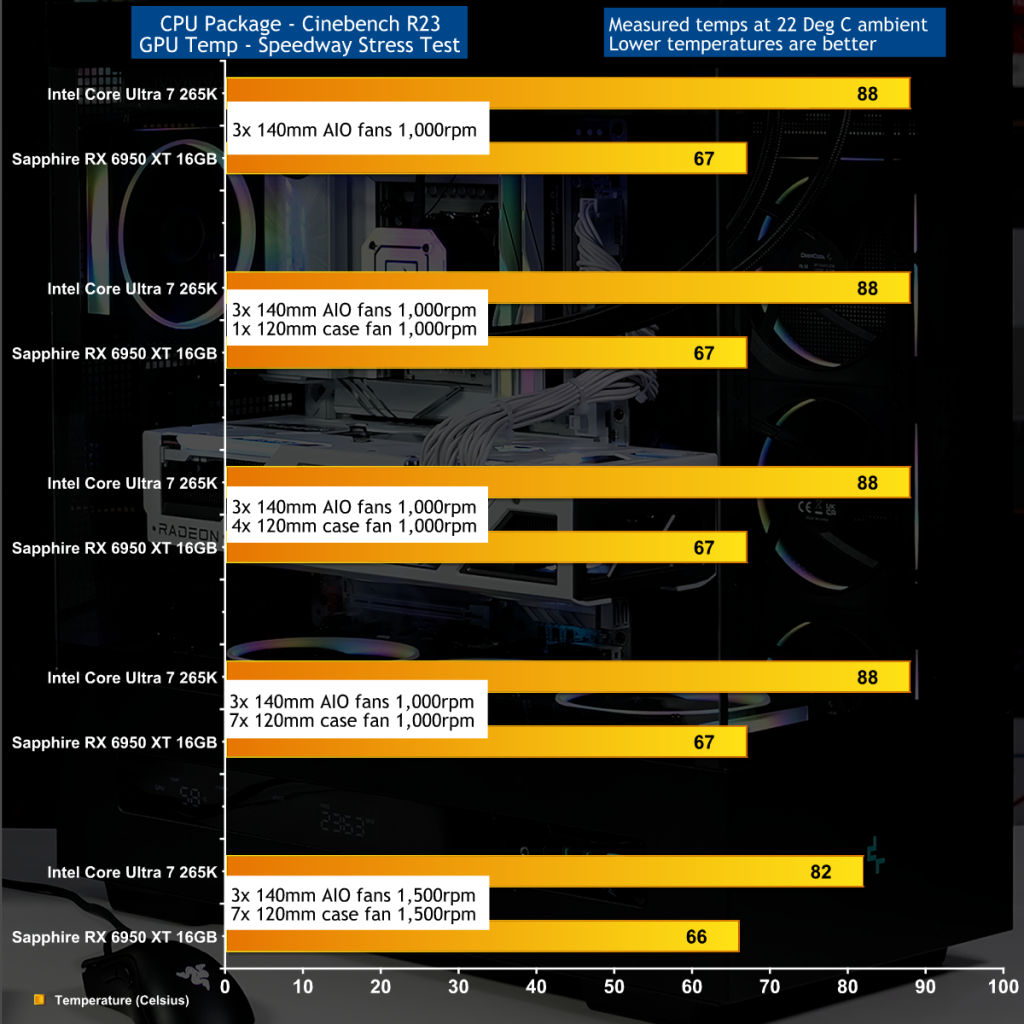 These results are some of the strangest we have seen as it doesn't much matter how many fans you install in the DeepCool CH690 Digital, but instead the main factor is how fast you run the fans. It is clear to us that the mesh pattern used by DeepCool is quite restrictive and the fans have to work hard to overcome that obstacle.