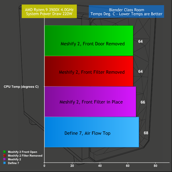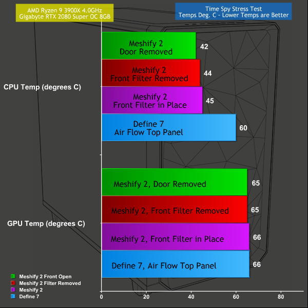 Fractal Design Define 7 does a perfectly decent job of cooling, however it is always clear the emphasis is on low noise levels, a clean aesthetic and a reasonable level of air flow. By contrast the Meshify 2 is all about cooling and air flow, and the results speak for themselves. When the case interior is set to the Open mode you have clean, unobstructed paths that will deliver results for gamers with high-end PCs. No doubt it would be a different story with the Meshify 2 in Storage mode but that is only to be expected and does not detract from the point that Meshify 2 is very impressive.