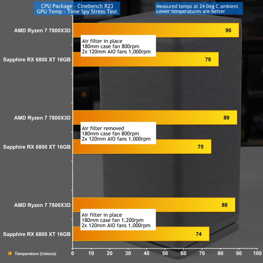 To put this case through its cooling paces we will be using a test system consisting of an AMD Ryzen 7 7800X3D, Sapphire Radeon RX 6800 XT and an SSD. This system allows us to produce a substantial amount of heat and effectively test the Fractal Design Mood‘s cooling capabilities.