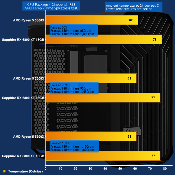 Our test PC was drawing 450W at the wall socket with 76W going to the Ryzen 5 and 255W going to the RX 6800 XT graphics card. That's a fair amount of load inside a mid-tower case and we consider the temperatures inside the Torrent Compact were absolutely fine. It is worth noting the bottom and front fans were all set to intake and there may be scope for improvement with the addition of a rear exhaust fan.