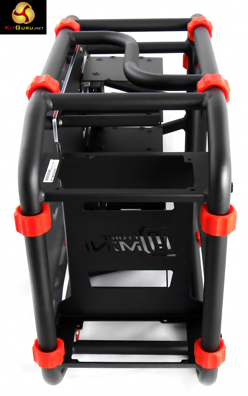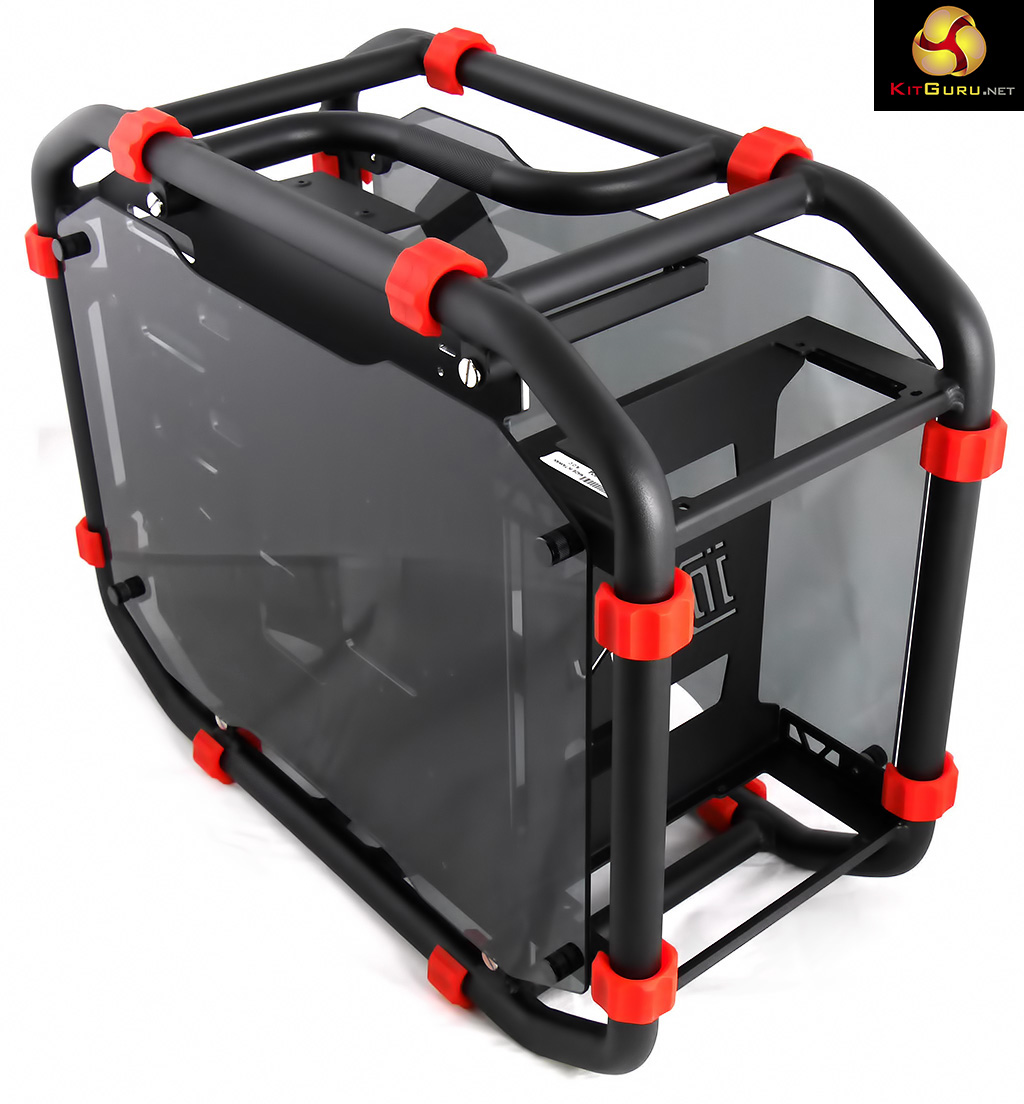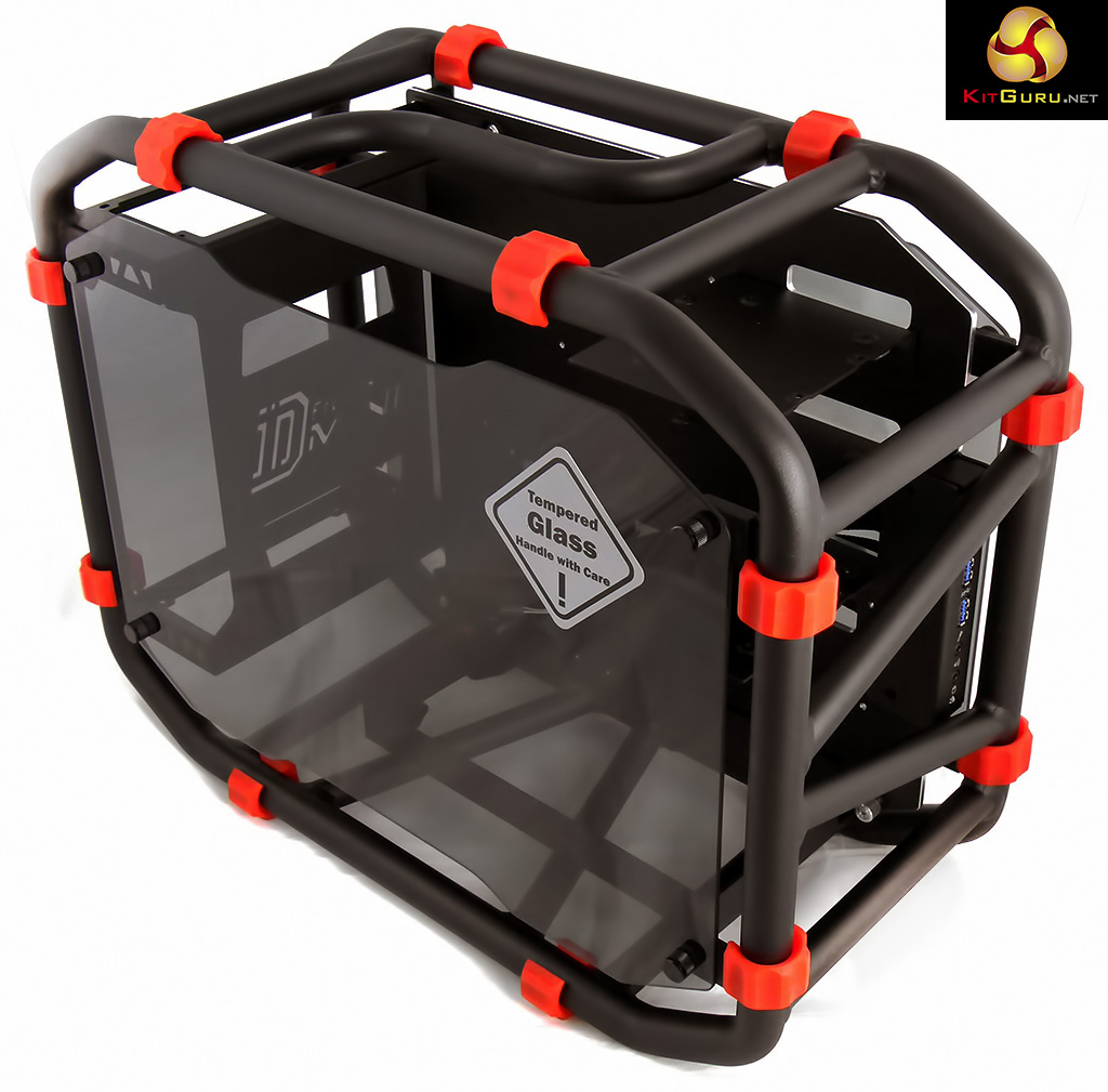 In-Win manufactures a curious mix of PC cases. In the past we have seen basic (but worthy) Mini-ITX cases such as the BL641 and more recently the GR One gaming tower and GT1 (as seen in our Falcon PC review). Then we come to the In-Win Signature Products which include the £320 D-Frame and this £249.95 D-Frame Mini. It's an open system that is constructed from welded aluminium tubes with smoked tempered glass panels on both side. The result is a visual delight. The chassis we saw is black with red silicon bumpers. Alternatively you can have red with black bumpers or orange with blue bumpers which may sound foul but actually looks amazing.