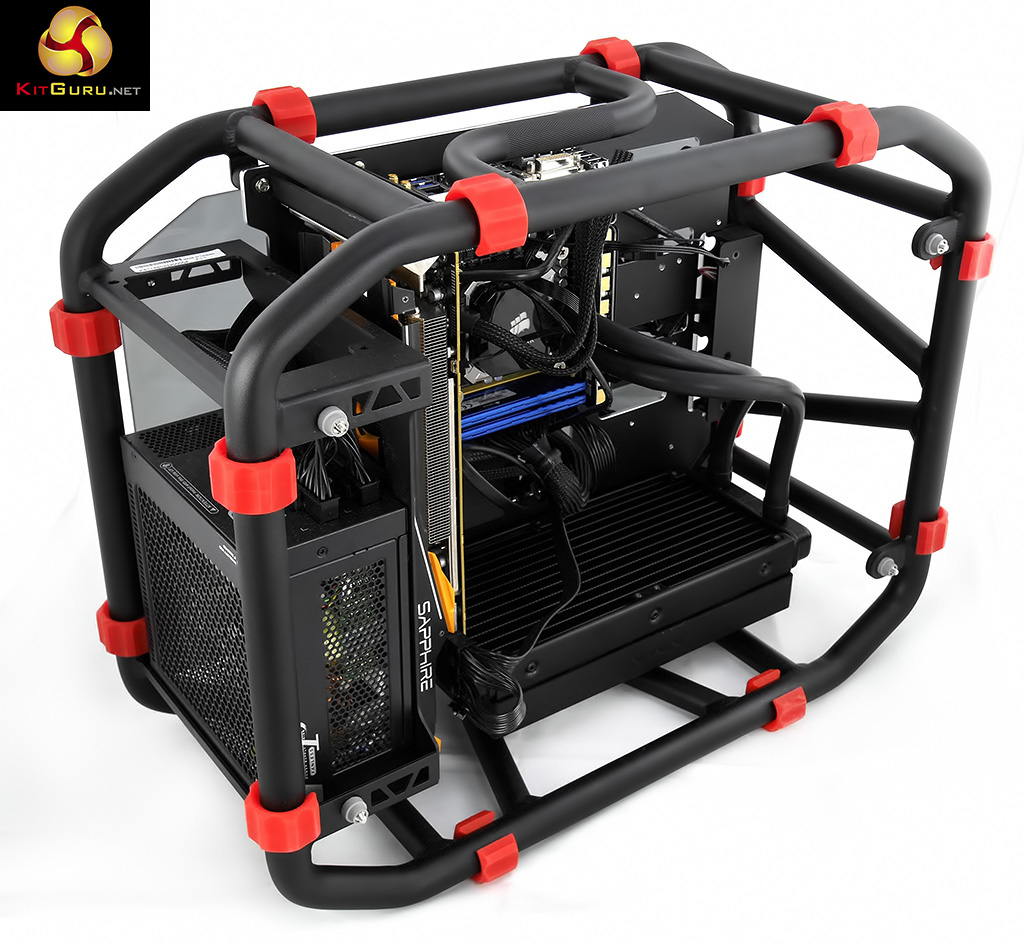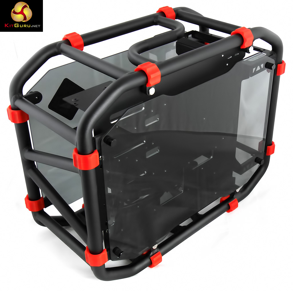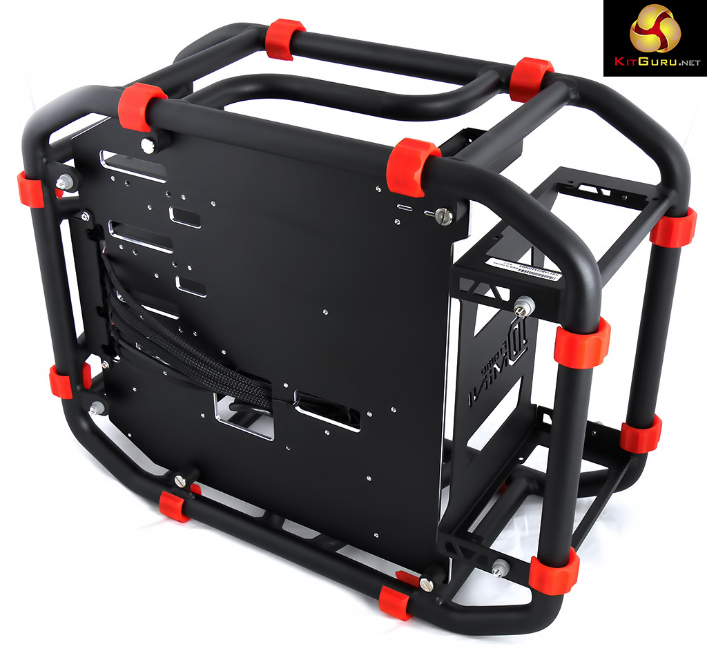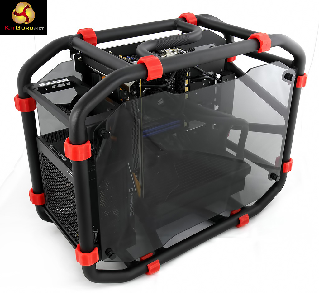 In-Win manufactures a curious mix of PC cases. In the past we have seen basic (but worthy) Mini-ITX cases such as the BL641 and more recently the GR One gaming tower and GT1 (as seen in our Falcon PC review). Then we come to the In-Win Signature Products which include the £320 D-Frame and this £249.95 D-Frame Mini. It's an open system that is constructed from welded aluminium tubes with smoked tempered glass panels on both side. The result is a visual delight. The chassis we saw is black with red silicon bumpers. Alternatively you can have red with black bumpers or orange with blue bumpers which may sound foul but actually looks amazing.