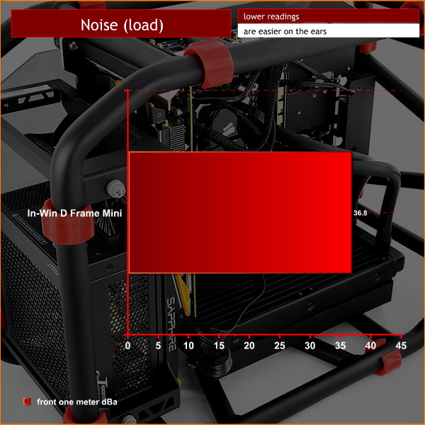 The system you see in the video is effectively silent at idle and very quiet under load. Raise clock speeds and fan speeds and of course you'll hear the extra noise immediately. There is no air filtering or baffling – it simply isn't possible with the design of the D Frame Mini – so you very much reap what you sow.