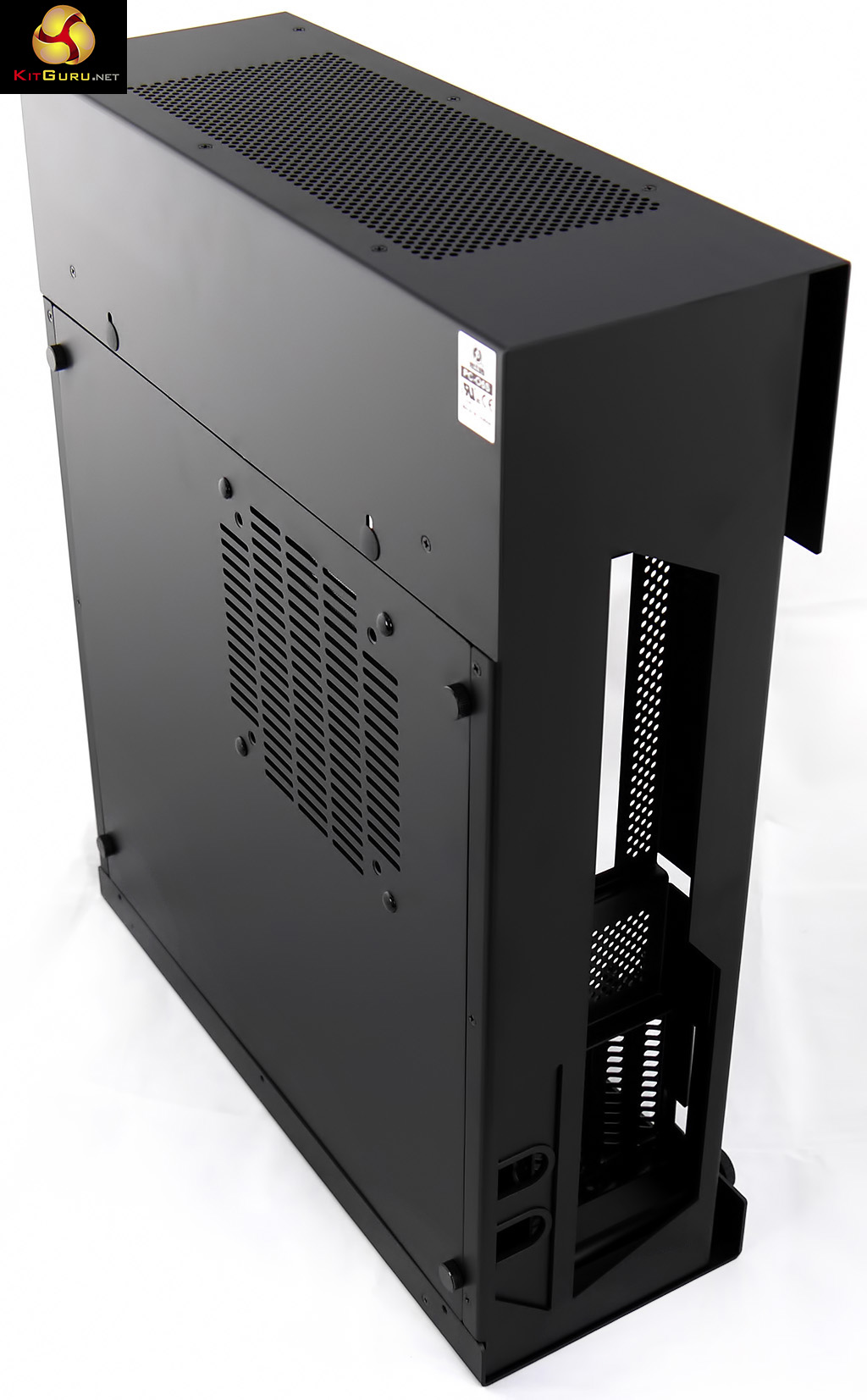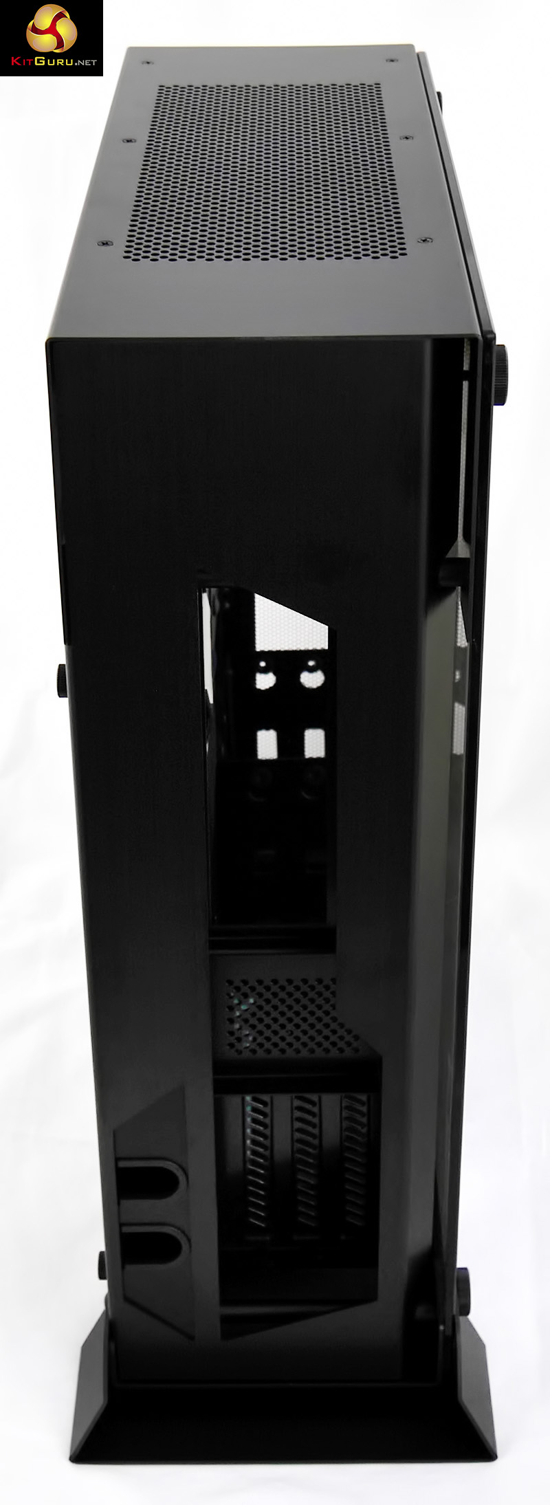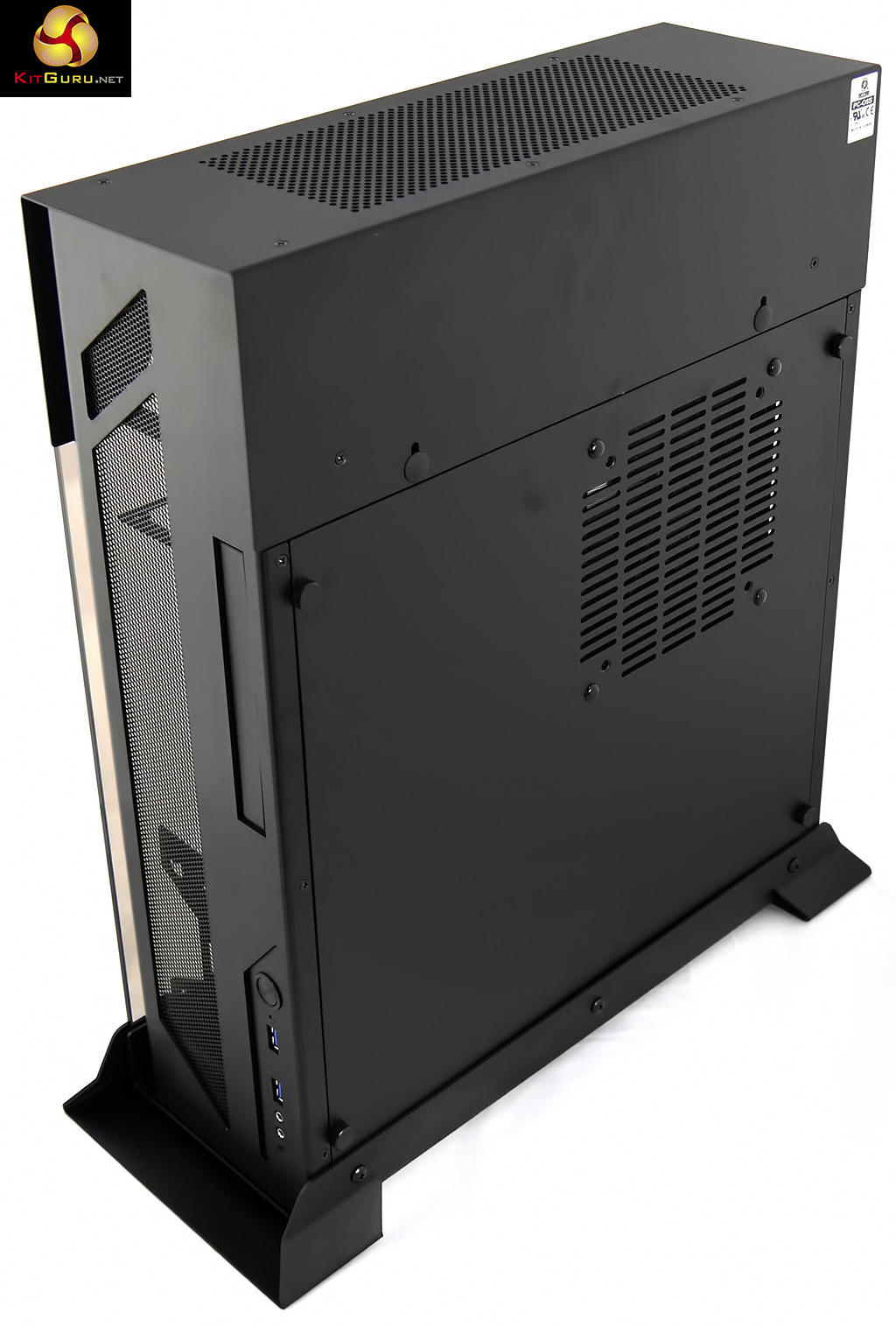 Lian Li describes the O series as a wall-mounted design (there are mounting holes in the chassis for that purpose although it seems like a curious idea), and there is an aluminium support in the package so you can stand the case on end. In fact the obvious orientation is to lay the PC-O5S flat like a piece of Hi-Fi hardware as this is how the USB 3.0 ports and slimline optical drive slot are arranged.