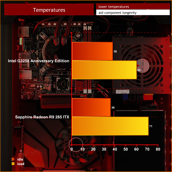 Cooling a dual core Pentium Anniversary and Mini-ITX Radeon R9 285 is a simple task and the PC-O5S managed it without any problem.