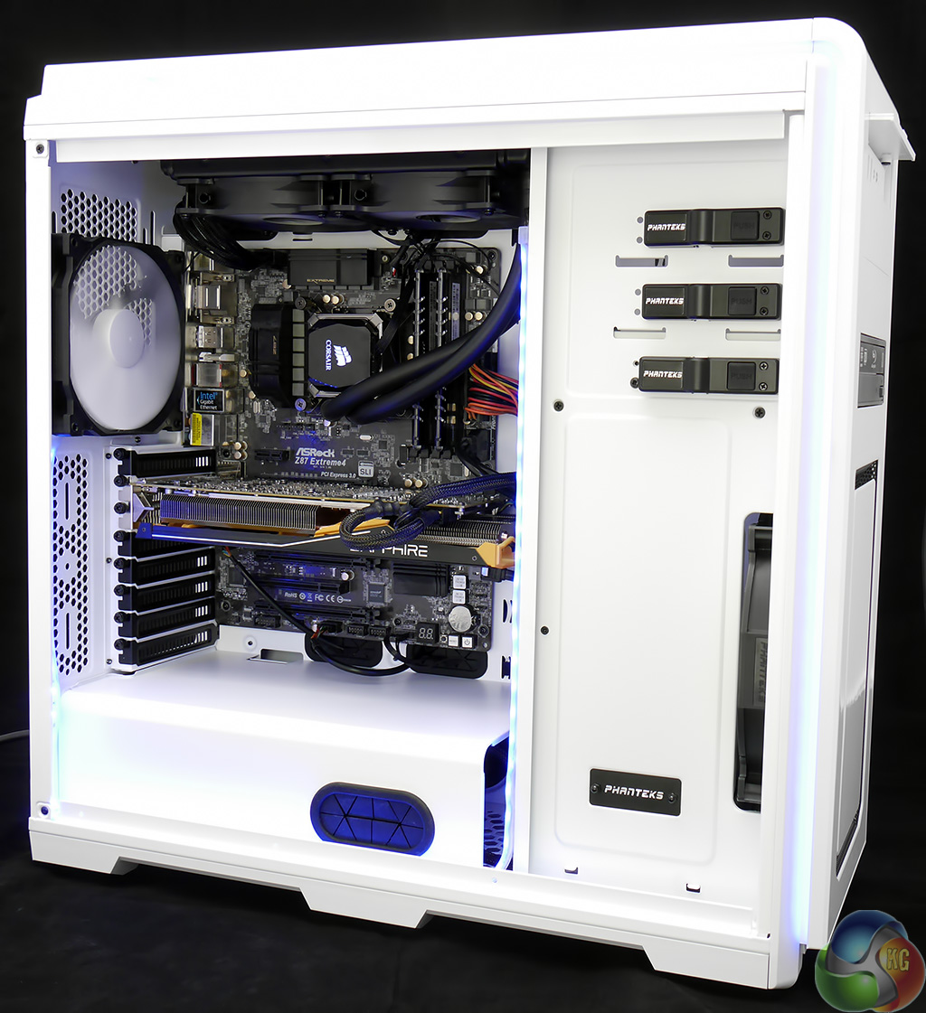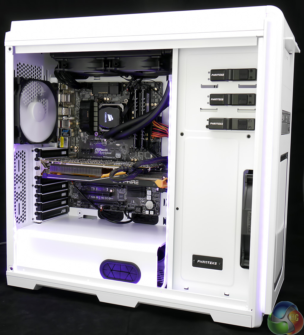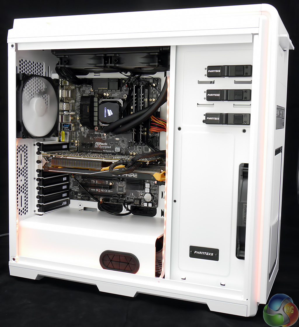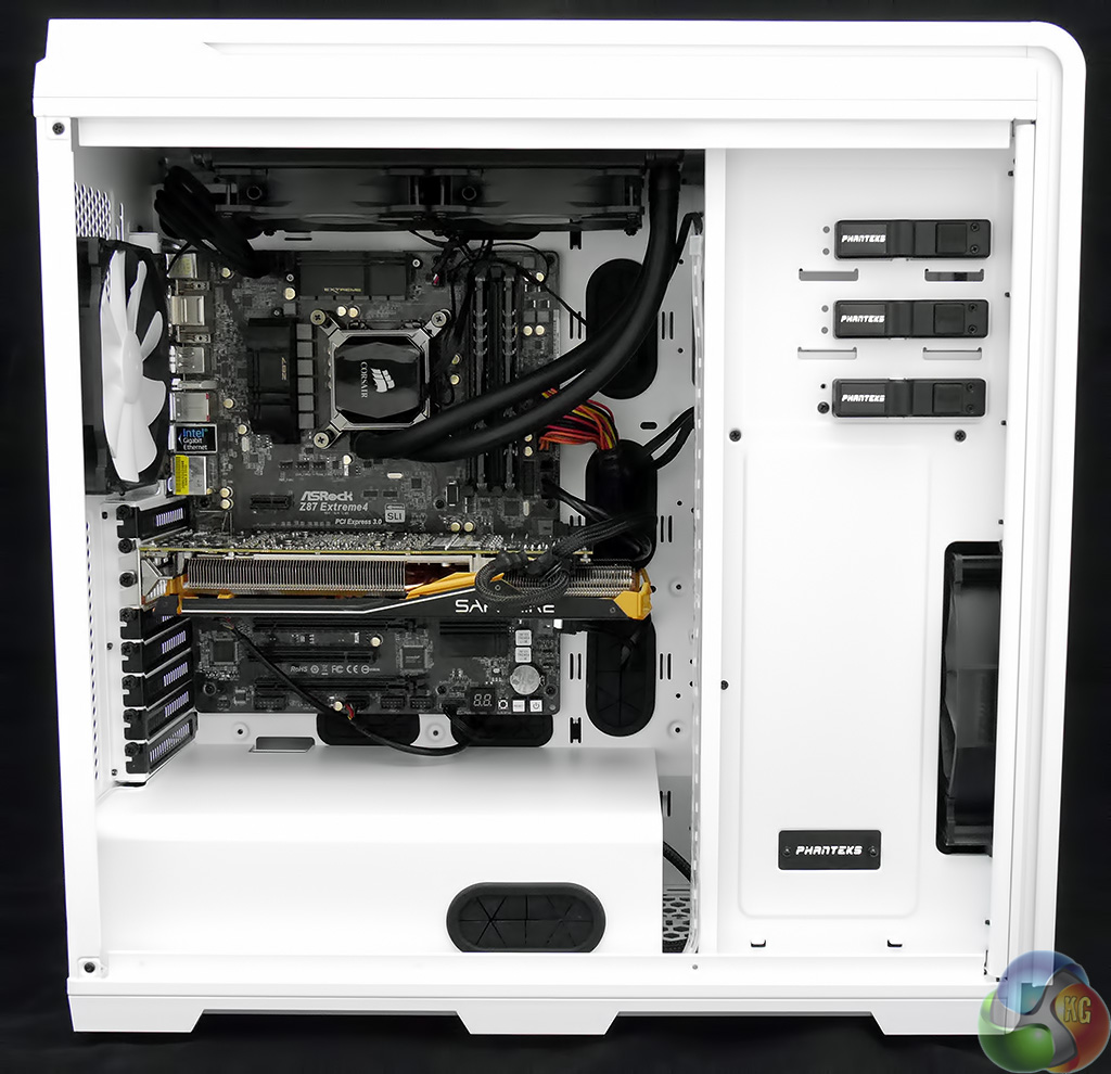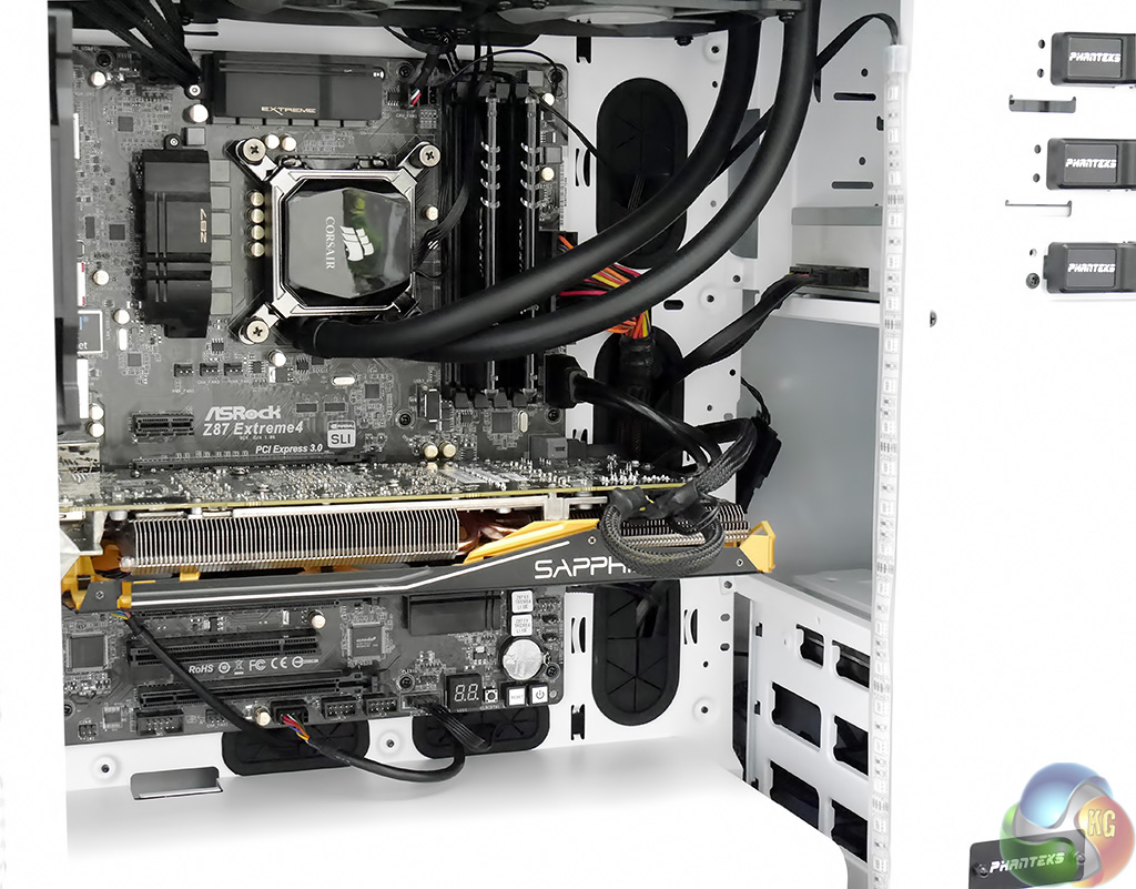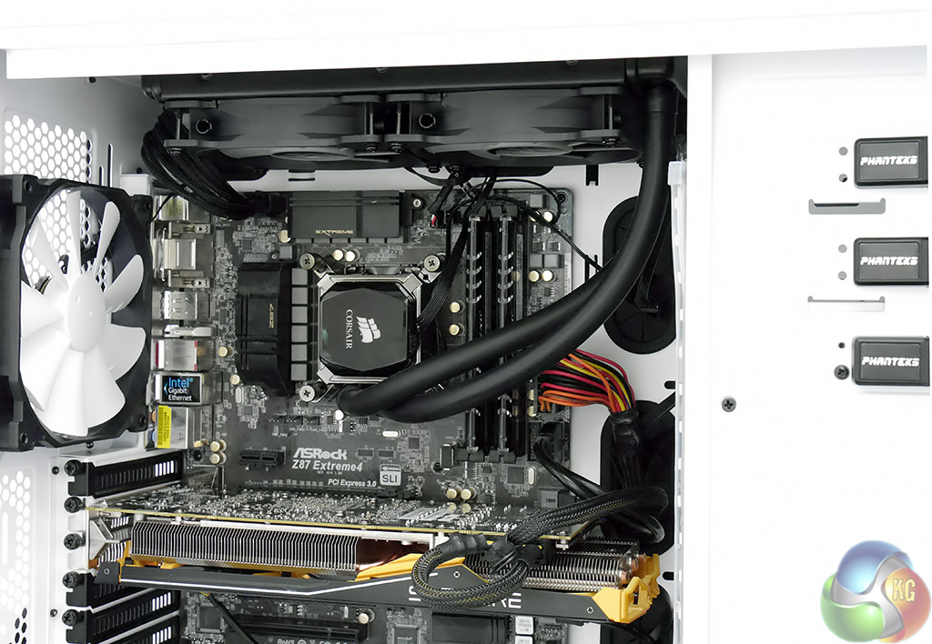 Installing an ASRock Core i7 motherboard in the Enthoo Luxe was a simple matter, however the same had also been true of the Enthoo Pro. It was during the installation of the Corsair H100i liquid cooling system that I came to appreciate the extra space in the roof of the case. The radiator vanishes out of sight with plenty of clearance above the top edge of the motherboard that allowed me to route the wiring pretty much wherever I wanted.