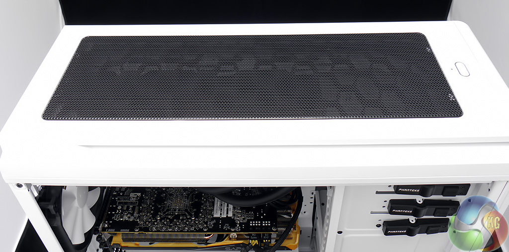 This top view shows you the access provided by the removable top grille. You can see the two latches that hold the grille in place on the left of the photo (the rear of the case). The latches were a bit hit and miss and it took a couple of attempts to get both latches to work at the same time.