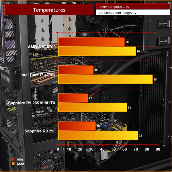 To put this case through its cooling paces we used two test systems due to the unique nature of the Phanteks Enthoo Mini XL. One system consists of an Intel Core i7-4770K on an Asus Z87I-Pro with Sapphire Mini-ITX R9 285 while the other uses an AMD A10-6700 on ASRock FM2A85X Extreme4 with Sapphire Radeon R9 290. These systems allow us to effectively test the Phanteks Enthoo Mini XL‘s cooling capabilities in the manner it is likely to be used in the real world.