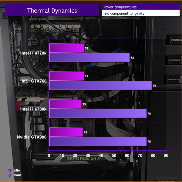 Cooling is a bit of an oddball as we installed a tiny air cooler on the Core i7-6700K to show off the innards of the Phanteks in our video and photos. As a result the top Mini-ITX system with Corsair H100i works exactly as expected while the Micro-ATX Core i7-6700K runs the CPU somewhat hotter than necessary. Air flow is good in this case and you can certainly cool the hardware down to a sensible level without any problems.