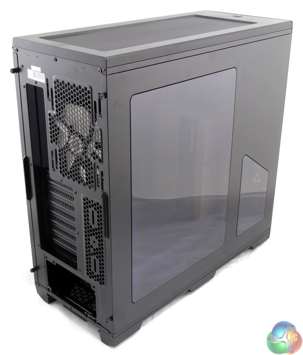 As you can see this is the windowed model that costs £89.99 in the UK. Alternatively you can have a plain side panel in a cheaper version that is priced at £79.99. I like the way the split window has been carefully positioned to show the Phanteks logo that is mounted on the hard drive tower, and I especially like the fact that the Phanteks logo plate is bolted on and can be removed as that displays confidence on the part of Phanteks.