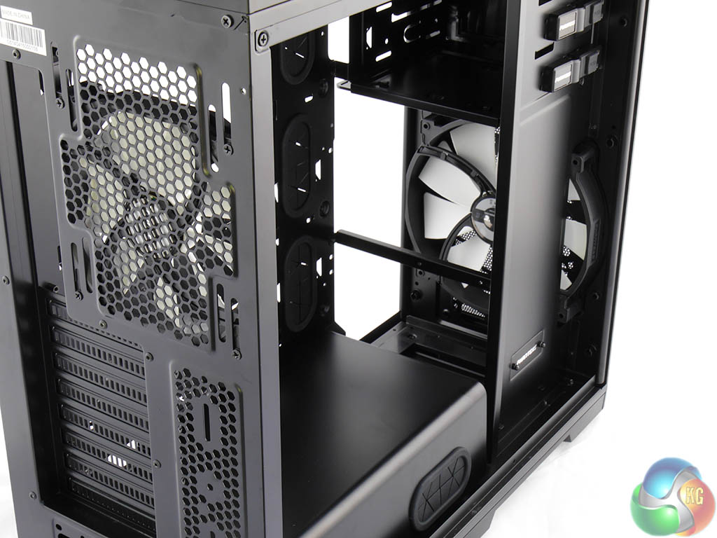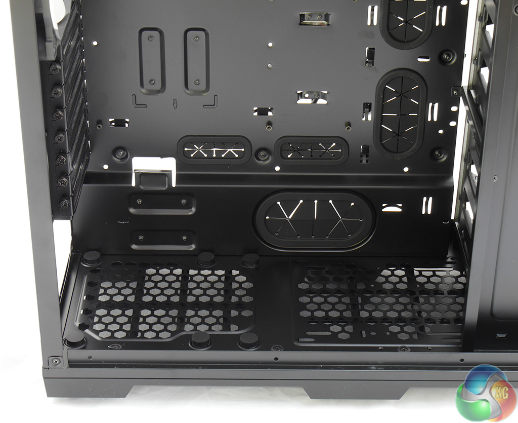 The PSU cover is held in place with three thumbscrews. If you intend to install cooling in the floor of the case you'll need to remove the cover but honestly, I wouldn't go down this route. The PSU cover really helps the installation and there are so many cooling options that you can leave the floor out of the equation.