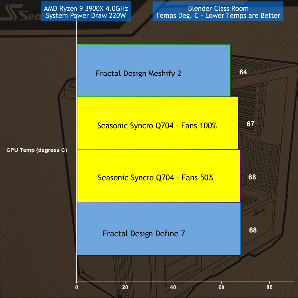 When we slowed the fans from 100 percent to 50 percent we saw the CPU temperature fell by one degree in Time Spy and rose by one degree in Blender. Let's split the difference and say that temperatures remained constant despite a huge change in fan speed, which means we have a bit of a puzzle on our hands. It is our best guess at least some of the air coming in the front of the case is immediately exiting through the roof.