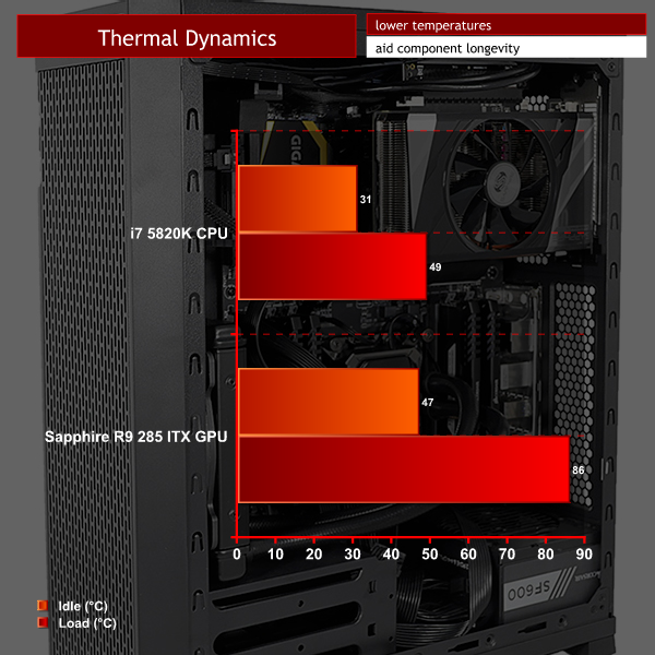 To put this case through its cooling paces we will be using a test system consisting of an Intel Core i7-5820K, Sapphire Compact ITX R9 285 and an SSD. This system allows us to produce a substantial amount of heat and effectively test the Thermaltake Core G3‘s cooling capabilities.
