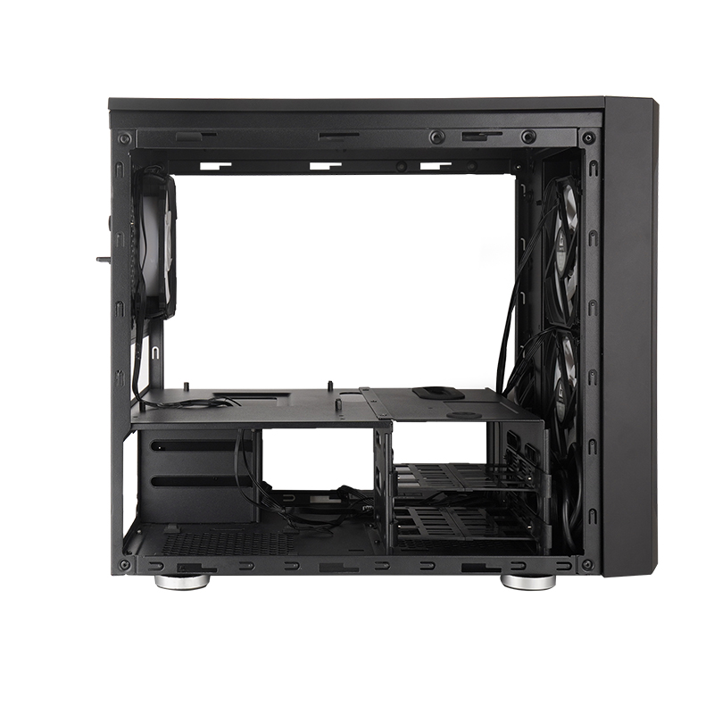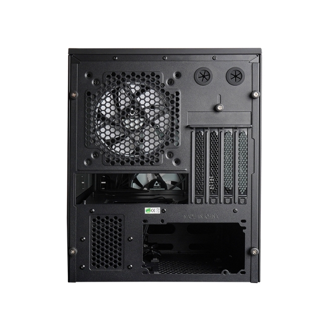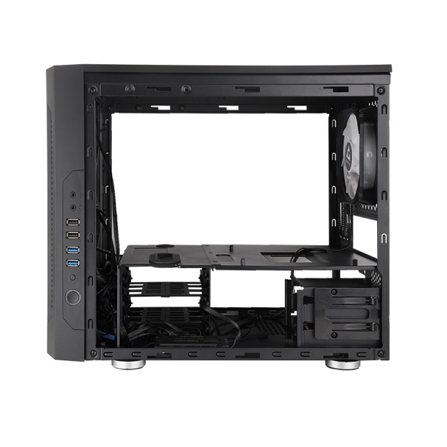 While this is a compact case, you won't have to compromise on storage, as you can have 2x 3.5″ and 2x 2.5″ drives installed, or 4x 2.5-inch drives. The front panel includes 2x USB 3.0 ports, 2x USB 2.0 ports, an audio-out port and a mic-in port.