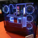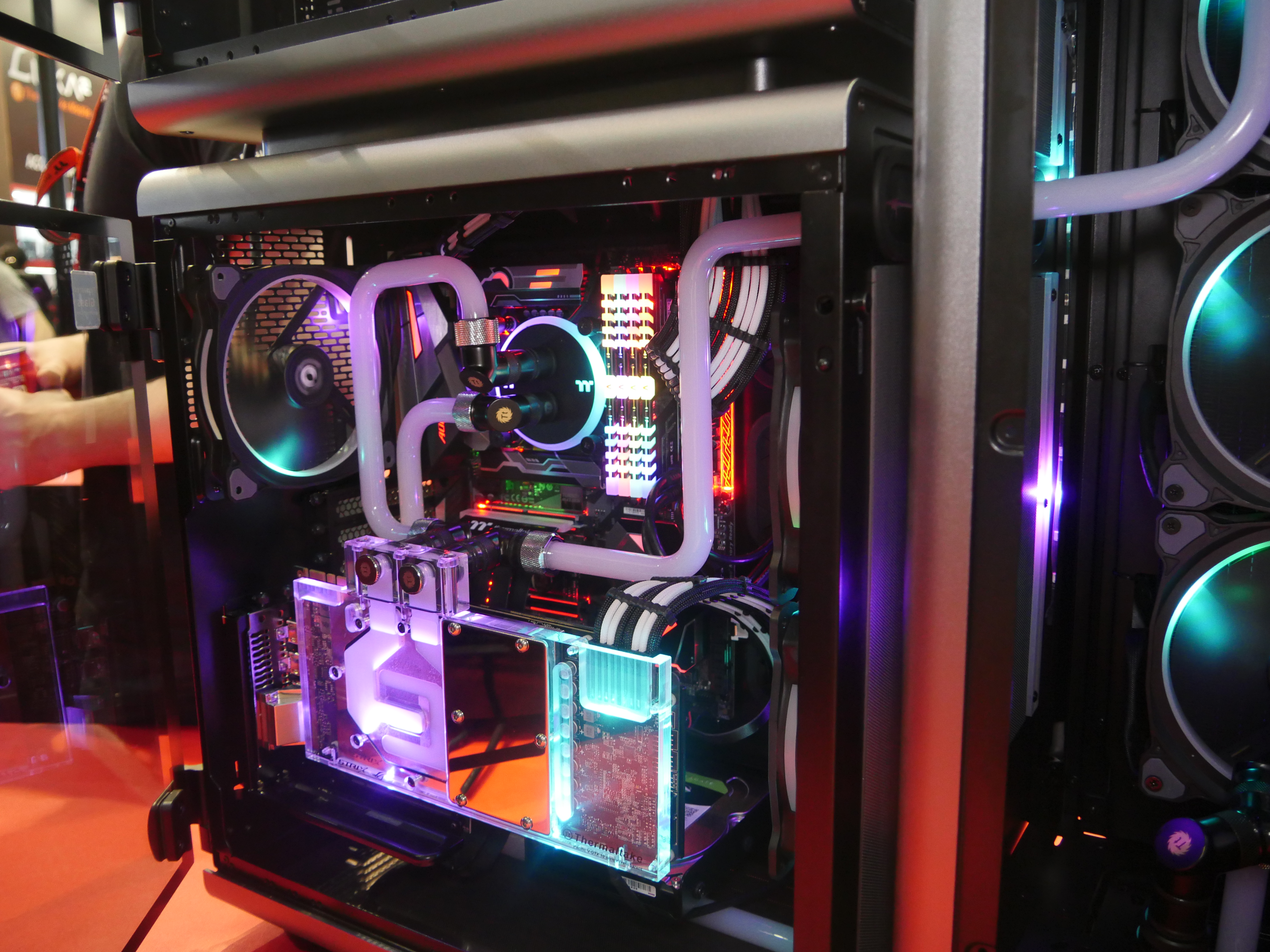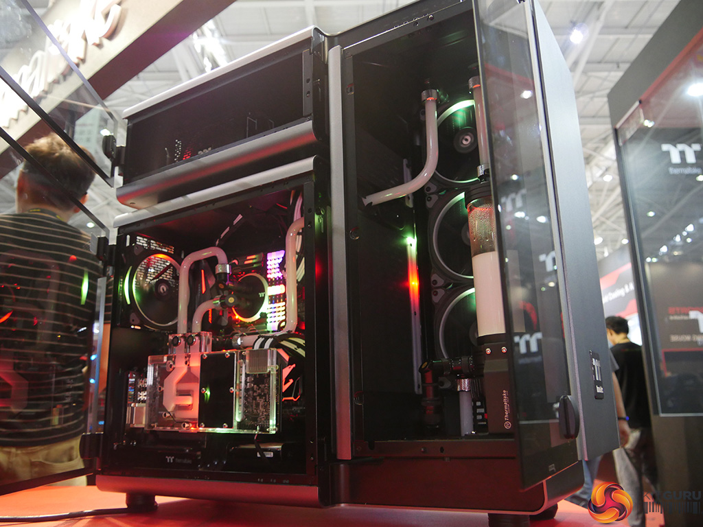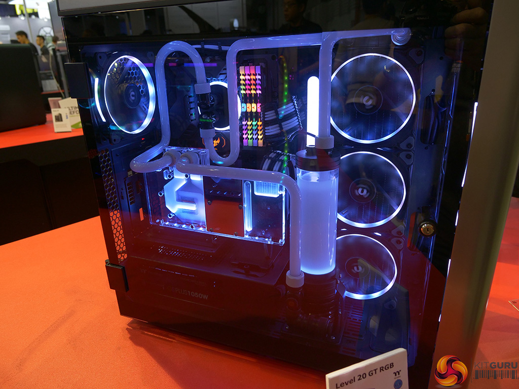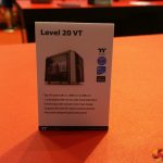The Level 20 XT follows up next, breaking a nice middle ground between the Level 20 VT and the larger GT. This case comes with a vertical ATX motherboard tray, and a huge amount of space for custom loop gear. In the version we saw, Thermaltake set up a 360mm radiator in the bottom of the case, with hardline tubing going up to the GPU and CPU.