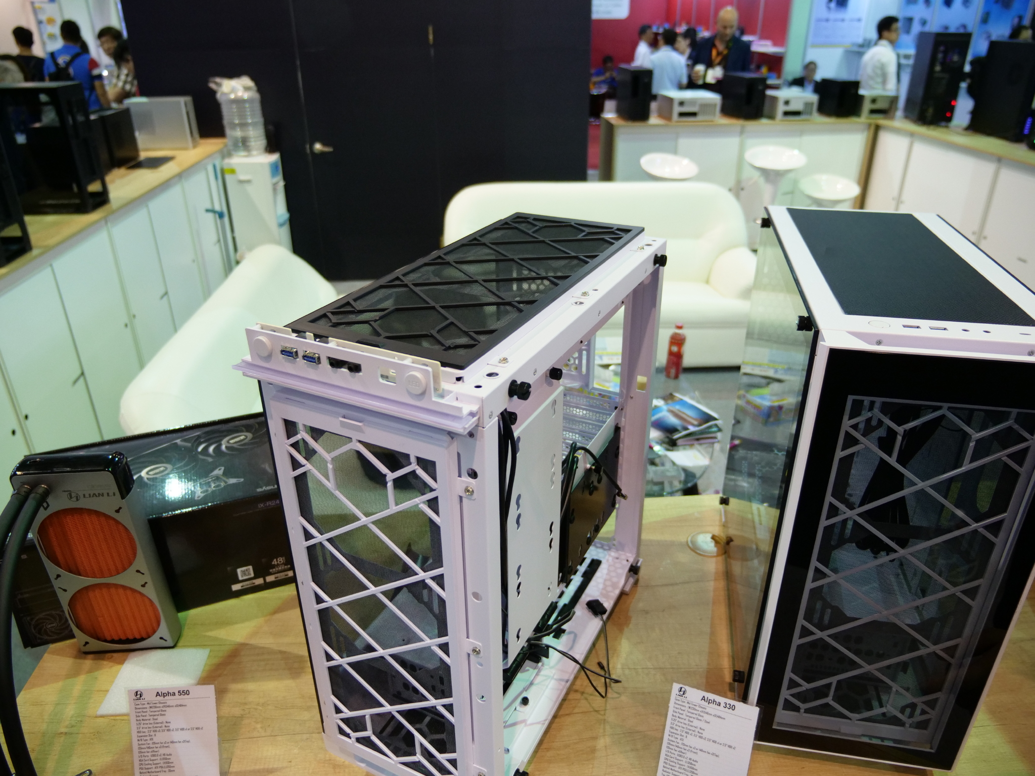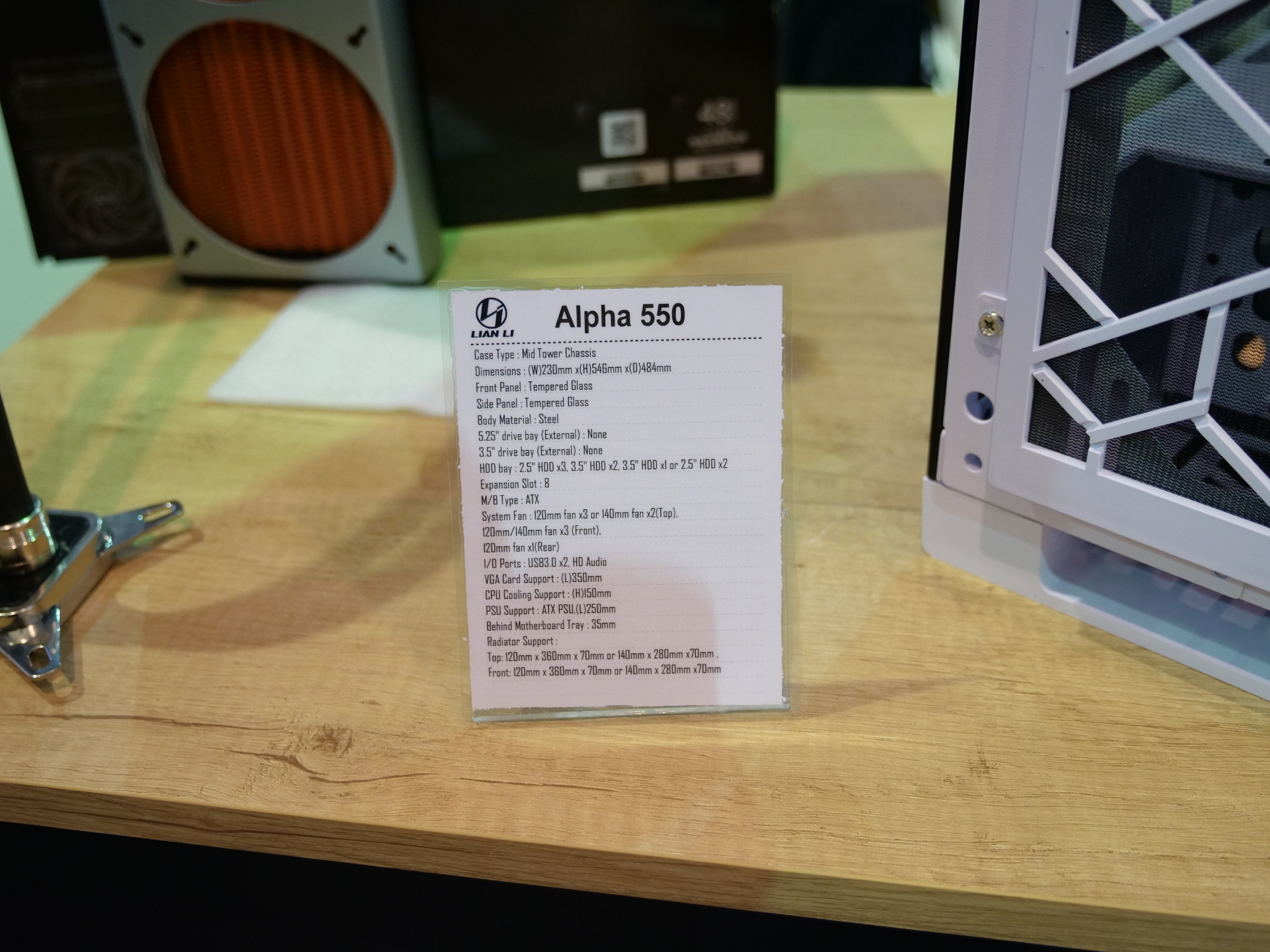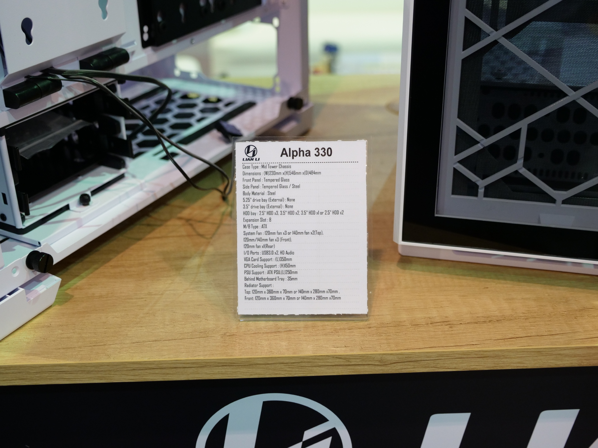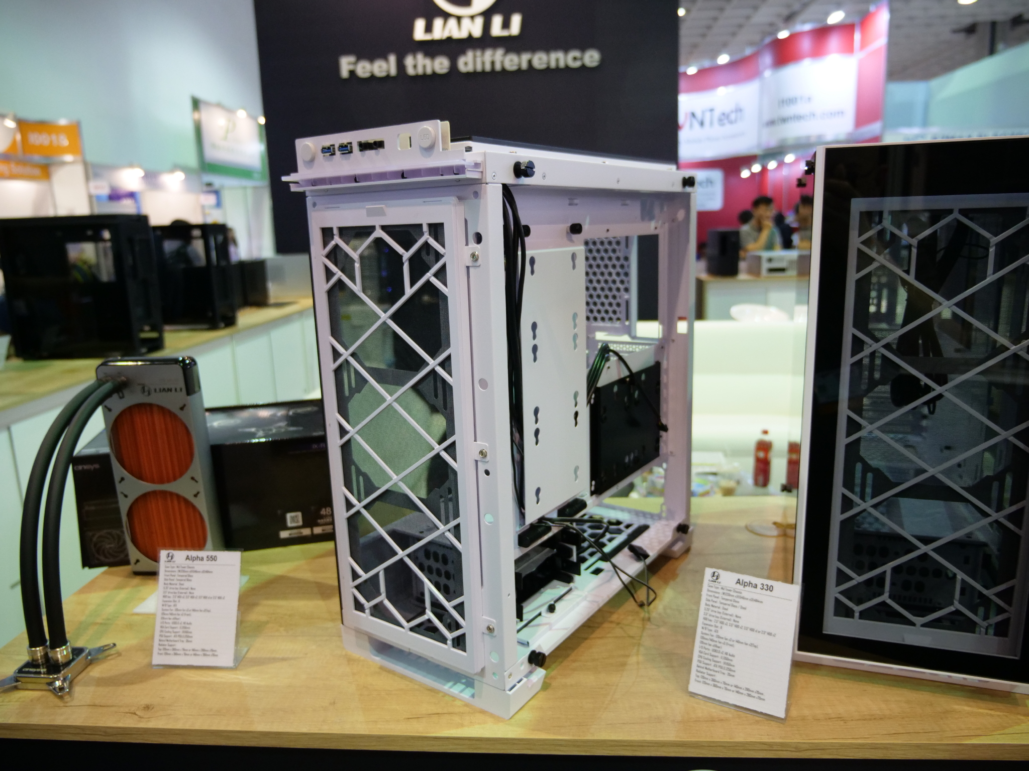 For starters, Lian Li showed off its new Alpha 330 and Alpha 550 budget cases. These are being manufactured in Taiwan and are primarily made of steel and plastic, rather than aluminium. Both are mid-tower chassis with tempered glass panels at the front and side.