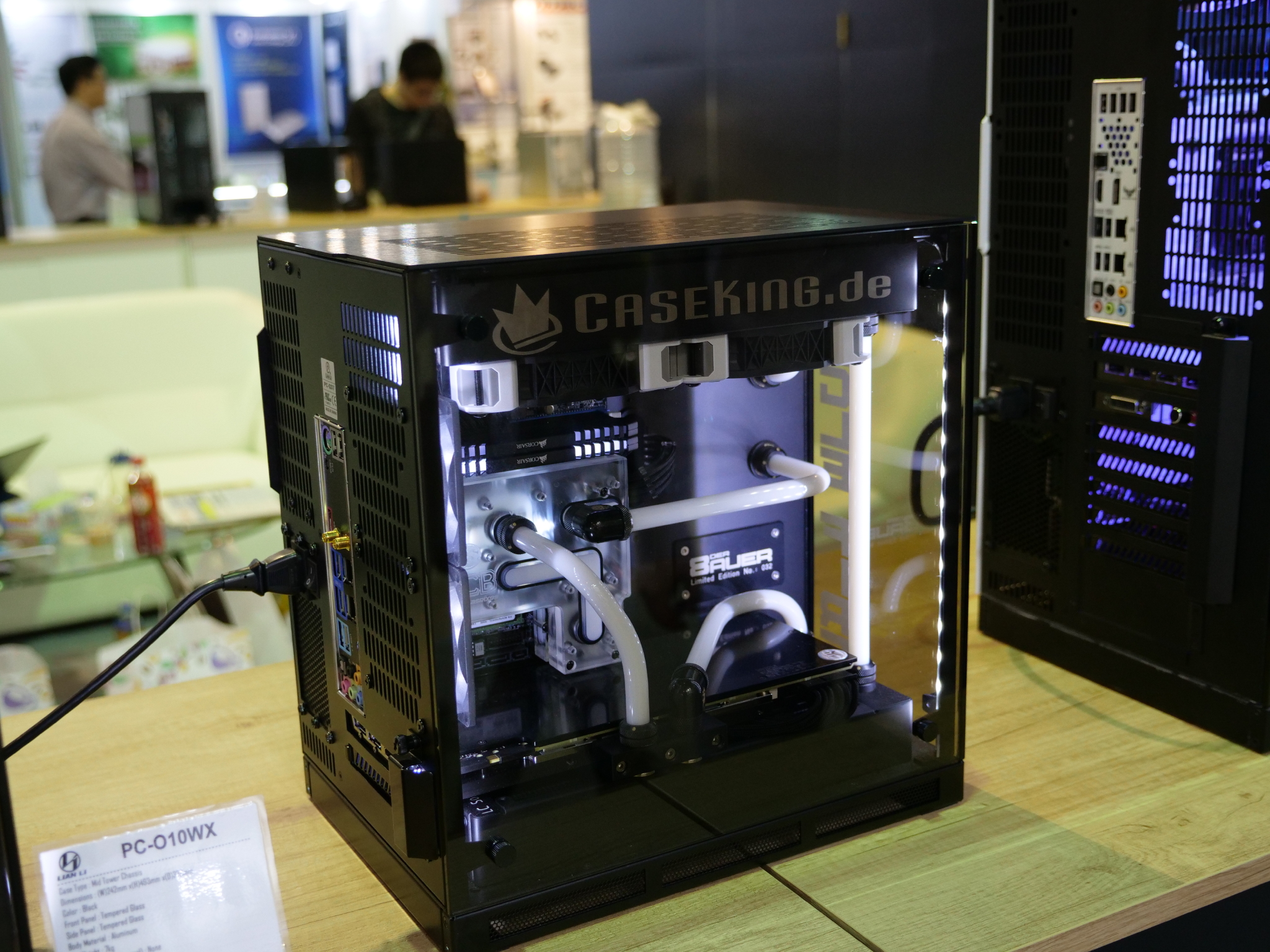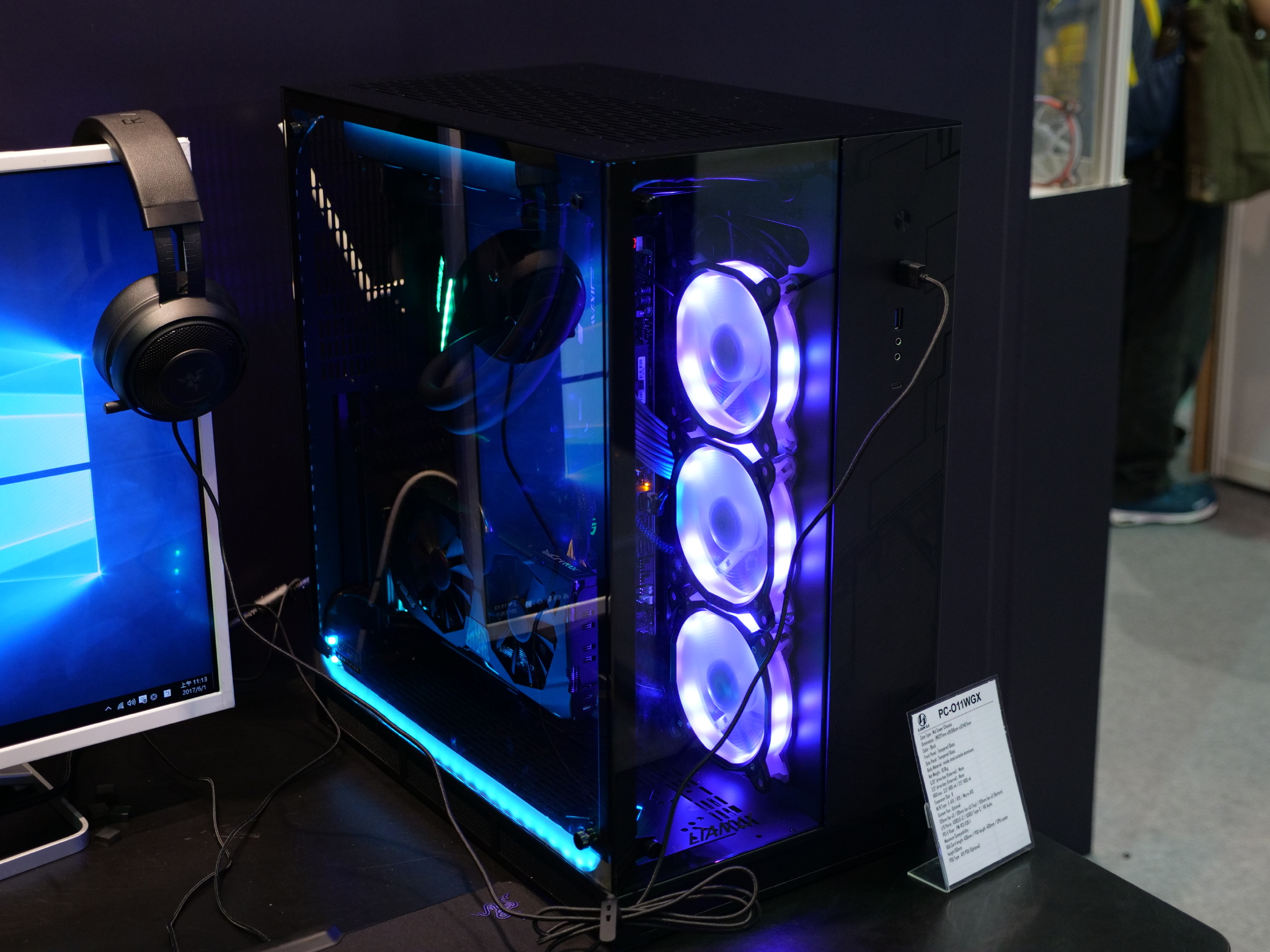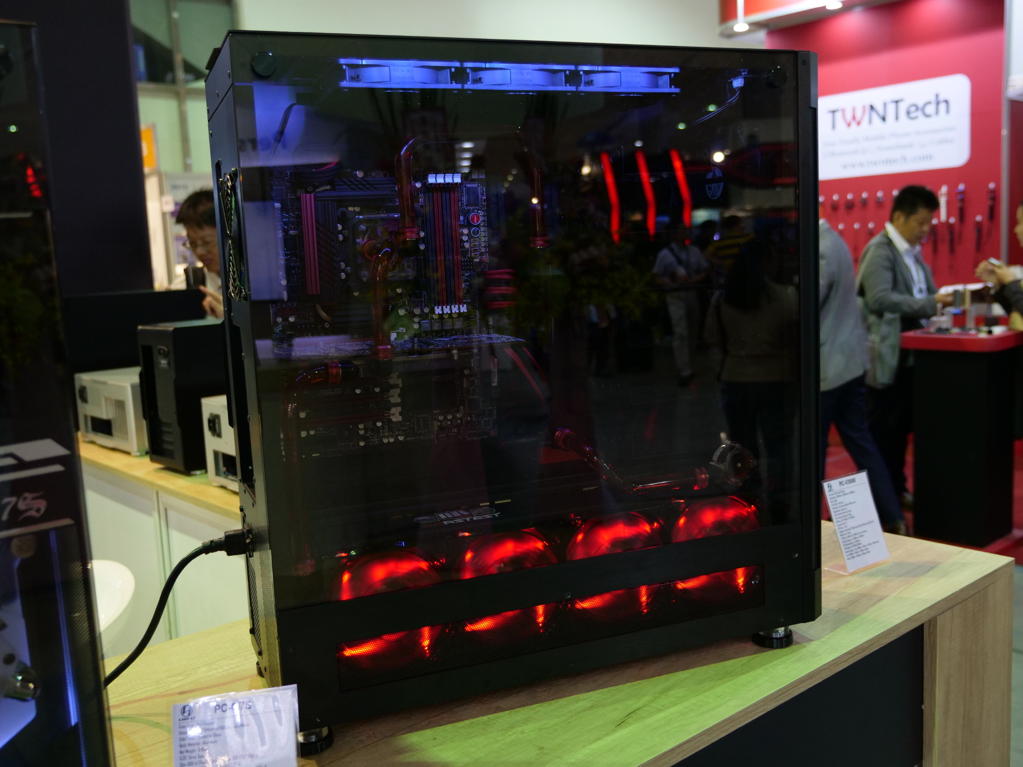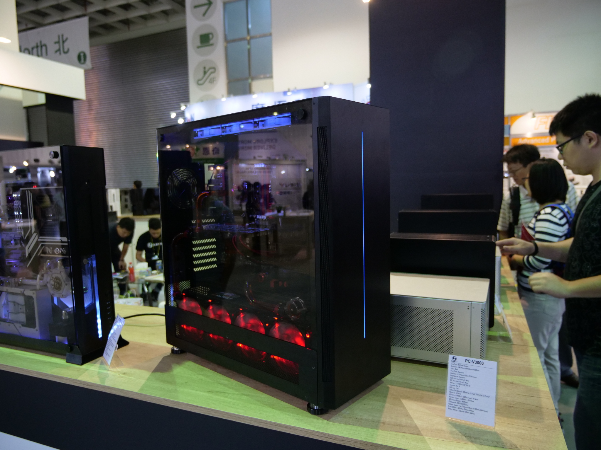 We also spotted the Lian Li PC-O11WGX and PC-O10WX, which cumbersome names aside, are both very nice. The former is a mid-tower chassis while the latter is a smaller and better suited to mATX and ITX. Both are clearly built to be hardware showcases, with large tempered glass windows and lots of room to hide cables. The PC-V3000, is a massive tower case with extra room for cooling, long GPUs etc.