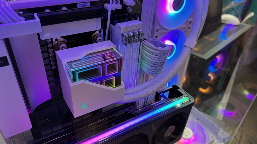 The system we see on display above uses the new case, along with a DeepCool LT820 WH AIO liquid cooler, a Gigabyte B550 Vision motherboard, 64GB of Asgard memory, a DeepCool PX850-G power supply, a Ryzen 7 5700G processor and a Sapphire Radeon RX 7900 graphics card.