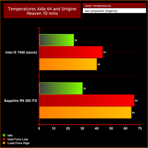 For temperature testing I used my standard test of Aida 64 and Unigine Heaven running for 10 minutes simultaneously. I performed two temperature checks. One with fans at low speed and another with a high speed setting as all the included fans are 3 pin.