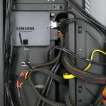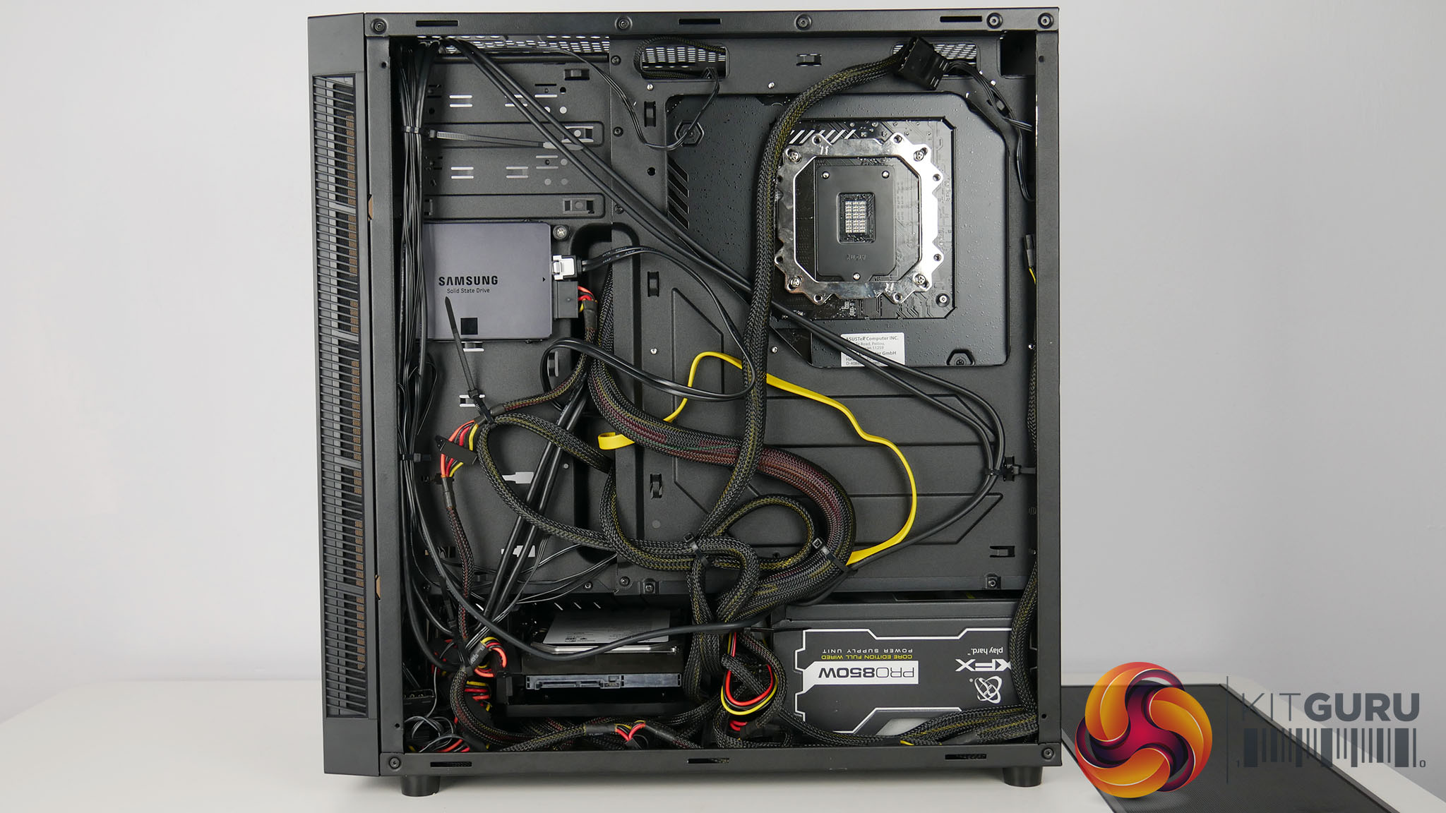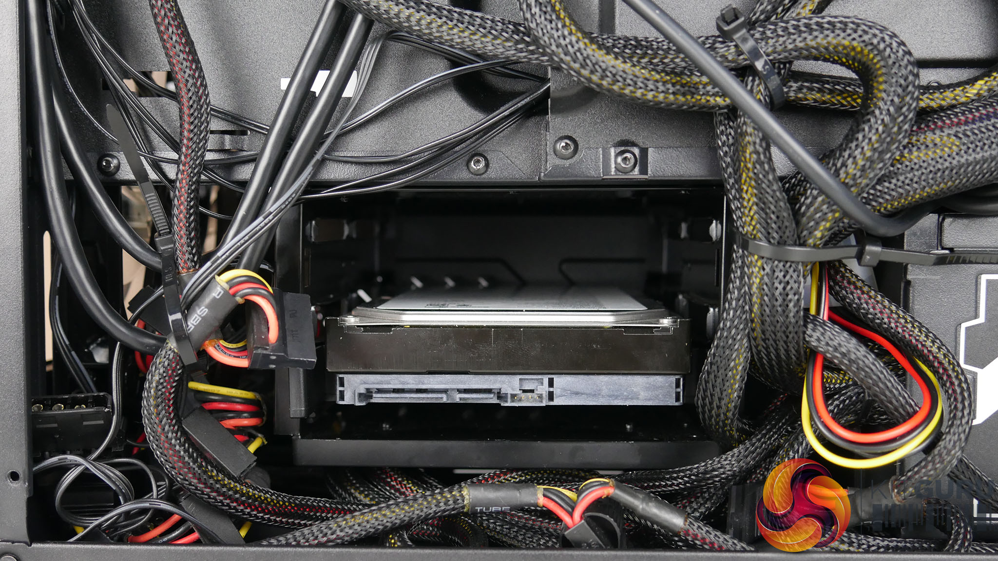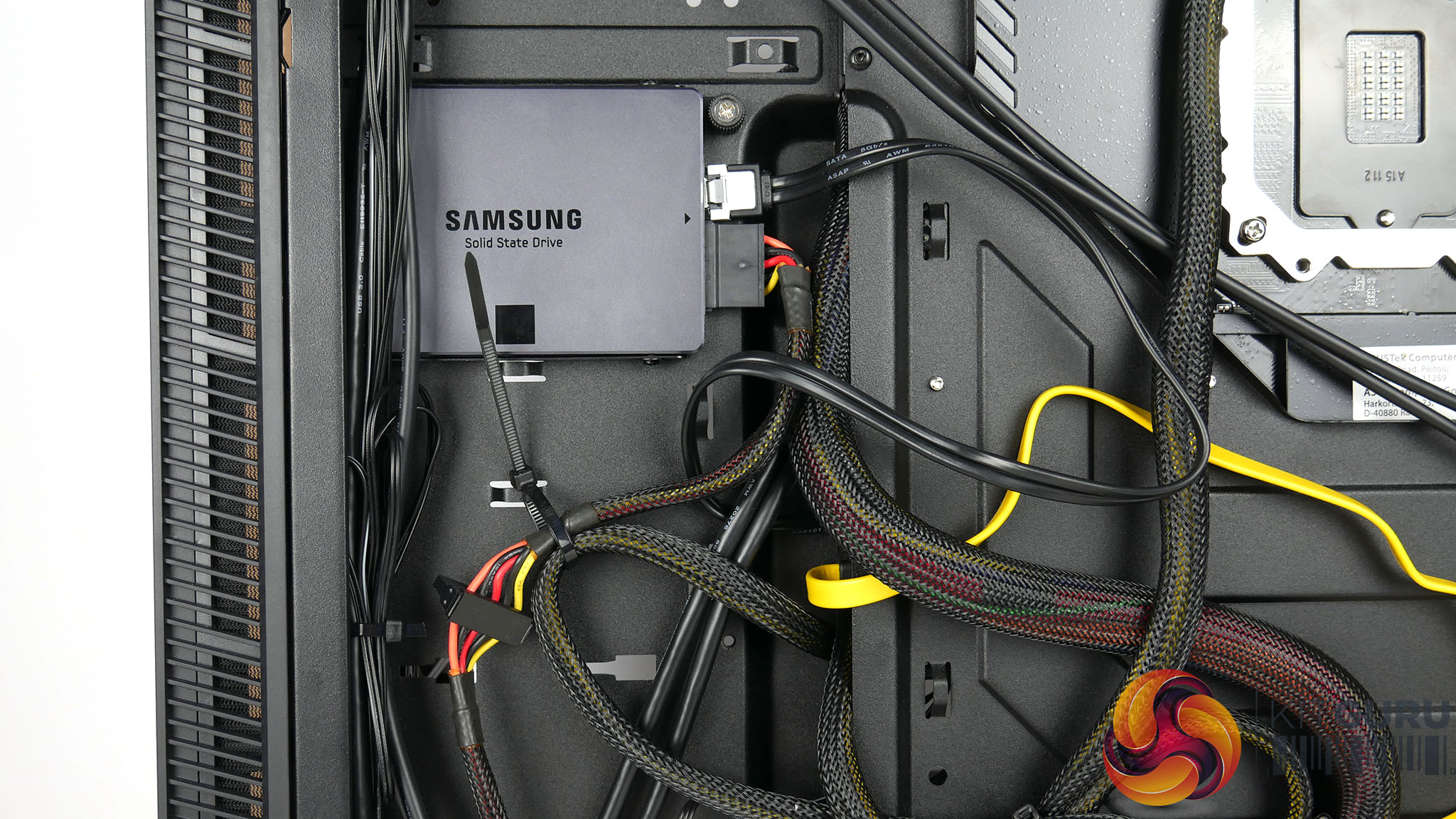 Building in the case is a relatively simple procedure, remove the left panel and you find the cable management area where we find many cable holes and space for two 2.5 inch Hard drives. These are attached with the included brackets that come with the case.